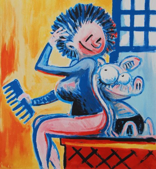 Forssan näyttelyssä esillä olevat teokset ovat taiteilijan signeeraamia serigrafioita. Näyttelyssä on esillä mm. ”Rakas hapannaama”, ”Menestyvän naisen takana on sika”, ”Herrasmiessika”, ”En tiskaa” ja muita normaaliin perhe-elämään liittyviä ihmeellisyyksiä.