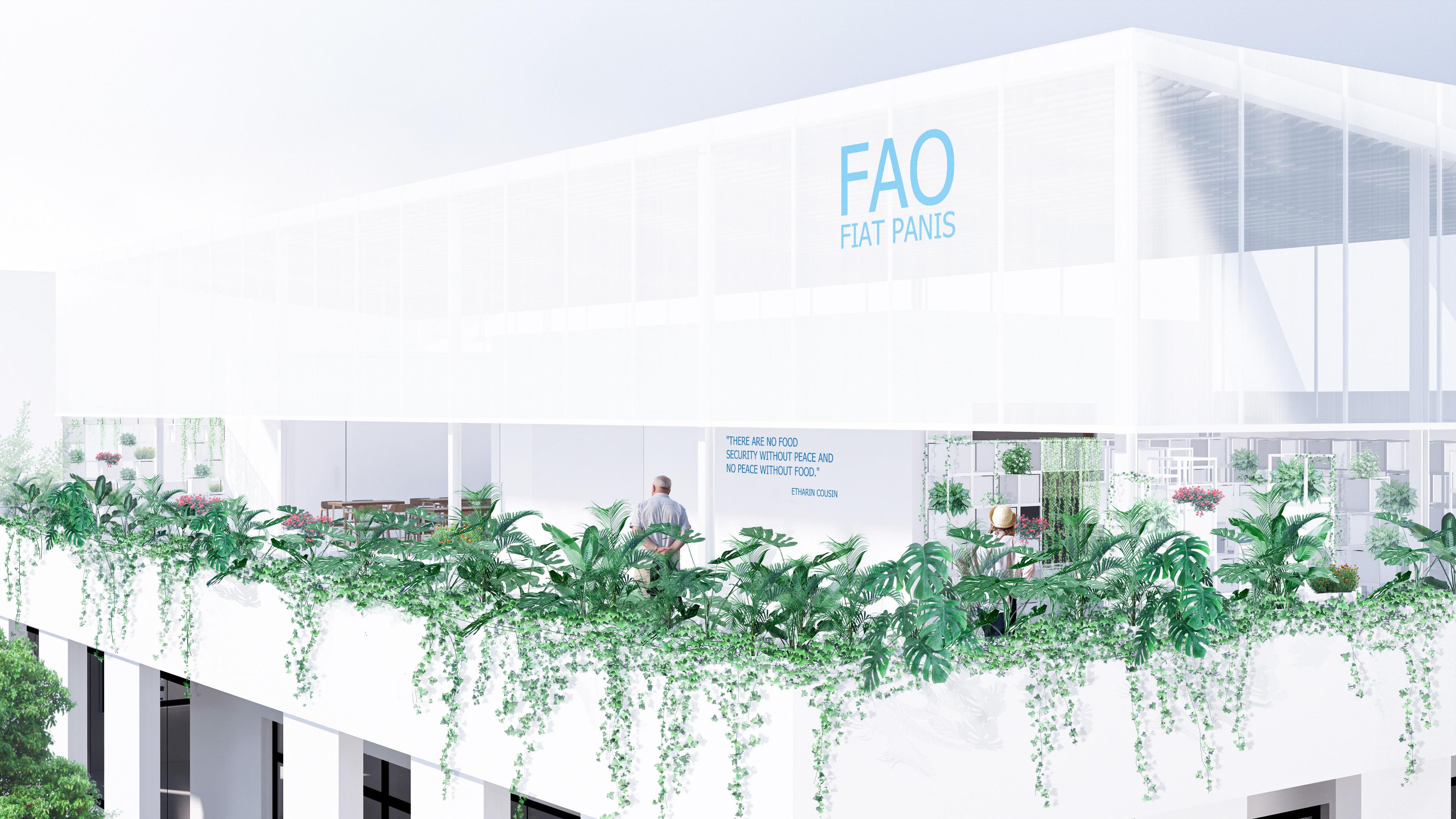 Being connected by the long corridor of planter boxed landscape, 3 divided zones come together as one being protected by a mutual shelter indicating a united family of the FAO community.