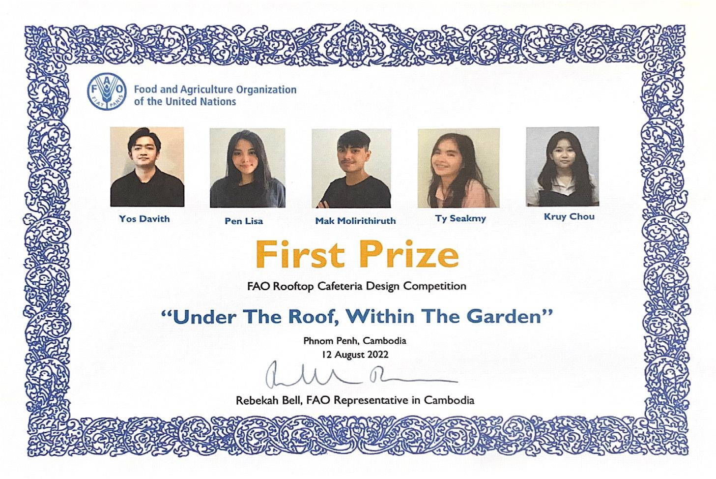 In June 2022 FAO, Cambodia invited architecture students from across the kingdom to compete in a design contest for the opportunity to design FAO Cambodia’s new rooftop cafeteria, which includes a small commercial kitchen and kitchen garden as well functional indoor and outdoor eating and meeting spaces. The students’ designs had to celebrate Cambodia, be green in design and construction, affordable and include multi-functional spaces. The prize for the winning team was an opportunity to work with UNOPS and engineers and FAO to have their design constructed on the roof of FAO, Cambodia’s new Representation.