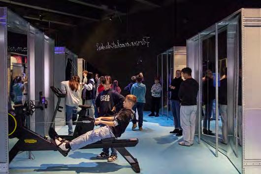 Oben: Der Ausstellungsbesuch beginnt (wie bei einer Ärztin). Jeder trägt gesunde und kranke Anteile in sich. Im Diagnoseraum verschwimmen die Grenzen zwischen Gesundheit und Krankheit. Im Notfallraum liegt das Gesundheitswesen auf dem Operationstisch. Rechts (von oben:) Die Ausstellung (barrierefrei) lädt immer wieder zu Gesprächen ein. EKG, Herz-Lungen-Maschine, Anästhesiegerät: Innovationen steigern unsere Lebenserwartung und eröffnen grosse ethische Fragen. Die Abteilungen im Gesundheitsmarkt ermöglichen mehr Orientierung im Labyrinth der Behandlungsangebote zu erhalten. In der Fitnessabteilung schauen Besuchende Videos, während sie sich selbst sportlich betätigen.