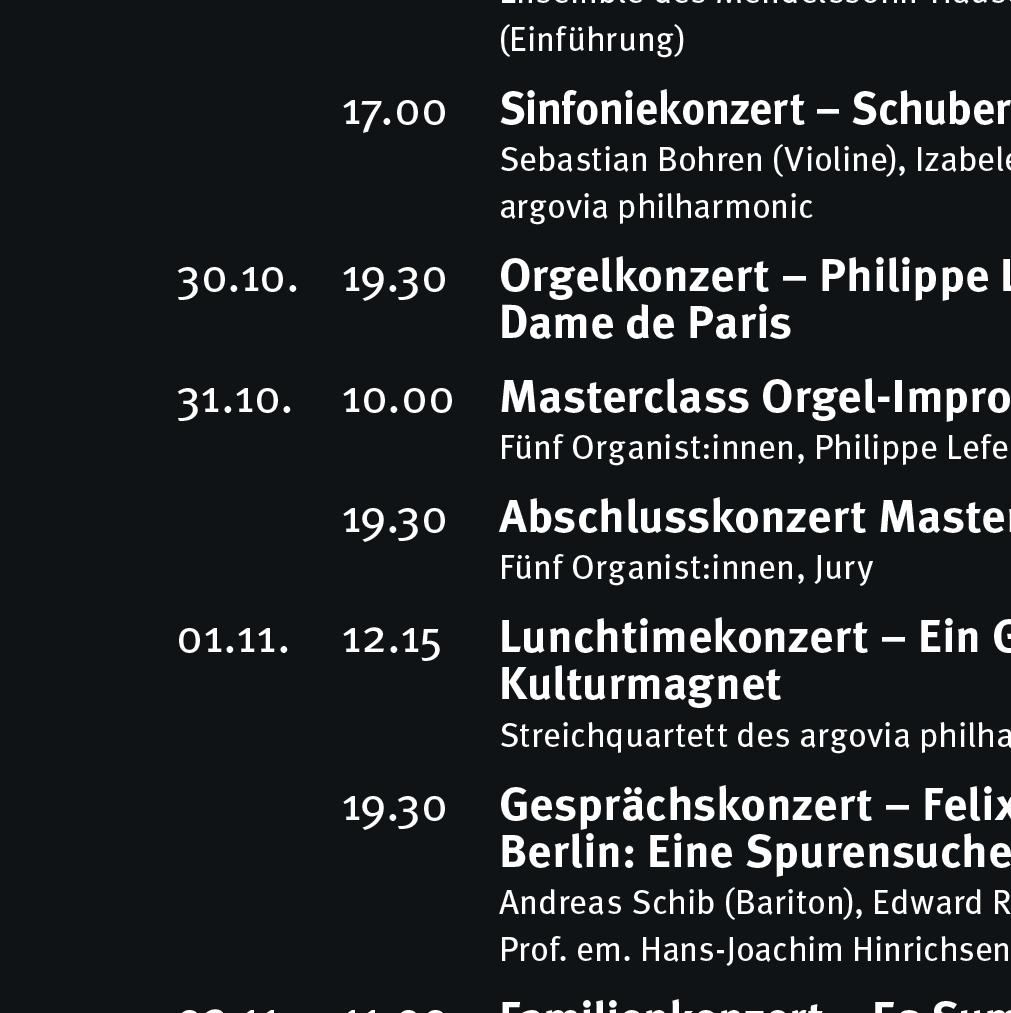 Dieses Jahr werden Werke und Persönlichkeiten, die Felix Mendelssohn Bartholdy in seiner Kindheit und Jugend und den späteren Berliner Stationen seiner Karriere inspiriert, beeinflusst und geprägt haben, beleuchtet. Mit den berühmten Sonntagsmusiken im Gartenhaus der Mendelssohns an der Leipziger Strasse in Berlin entstand in der ersten Hälfte des 19. Jahrhunderts ein musikalischer und gesellschaftlicher Hotspot, der bis heute strahlt. Diese Sonntagsmusiken und Werke, die in Mendelssohns Berliner Schaffensjahre fallen, stehen im Zentrum des Festivals. Das Publikum darf sich auf Sinfonie-, Kammer-, Gesprächs- und Familienkonzerte, Liederabende, Aarau singt, Schulhauskonzerte, den traditionellen Festgottesdienst und das krönende Jubiläumskonzert zum Festivalabschluss freuen. Natürlich darf auch die jährliche Masterclass nicht fehlen – diesmal für Orgel-Improvisation.
