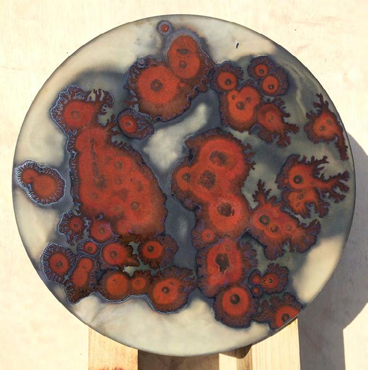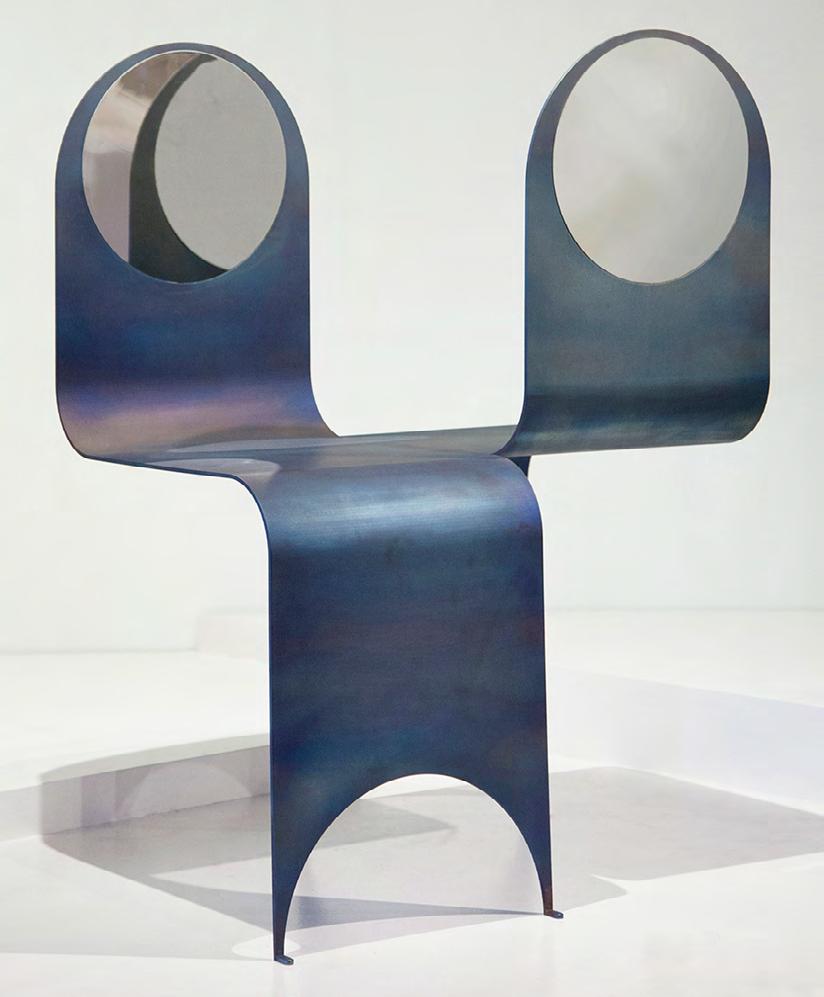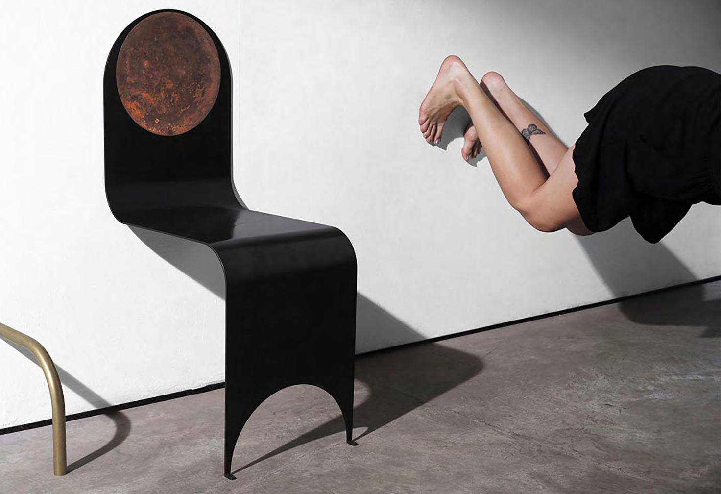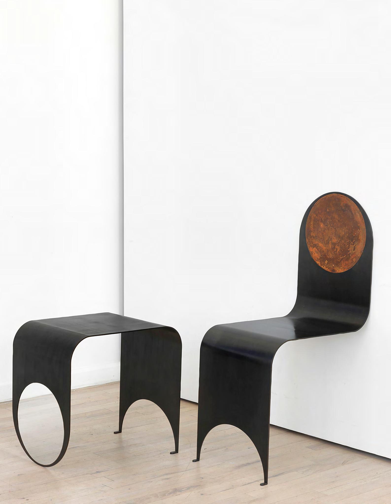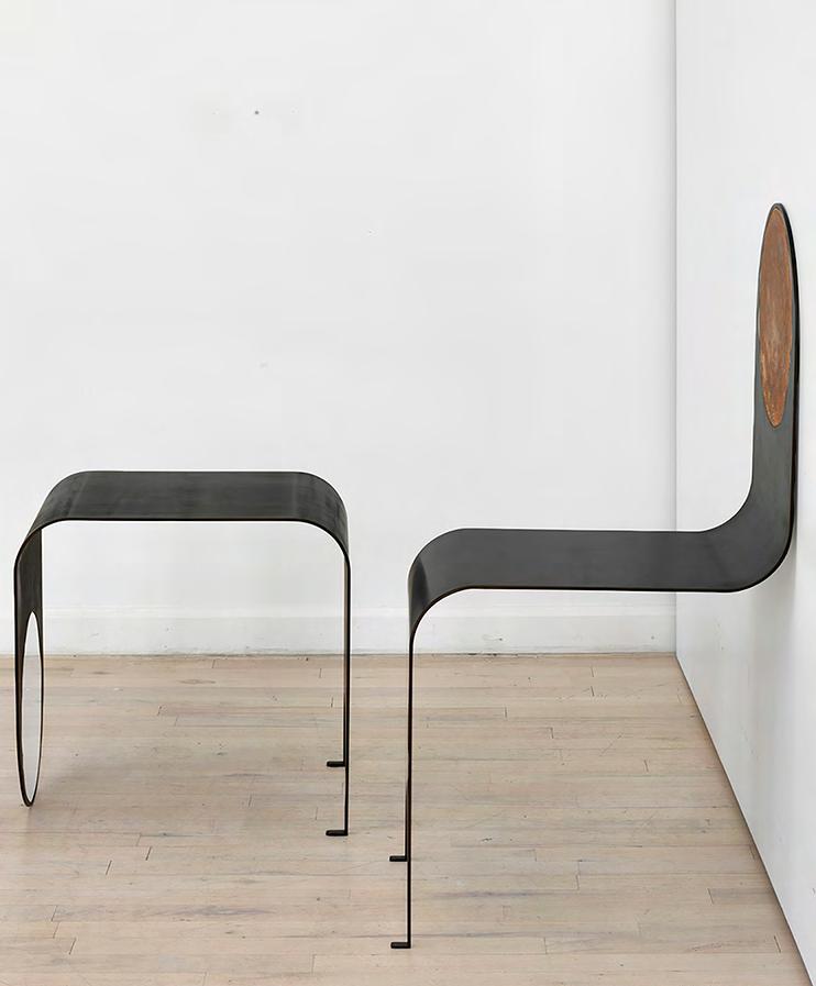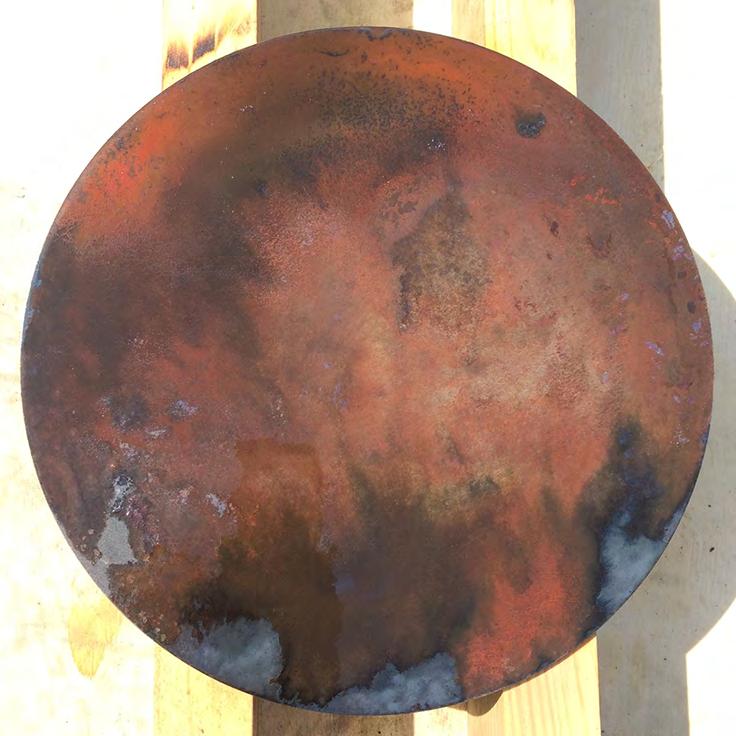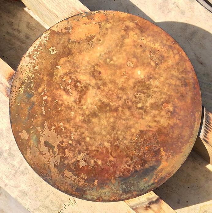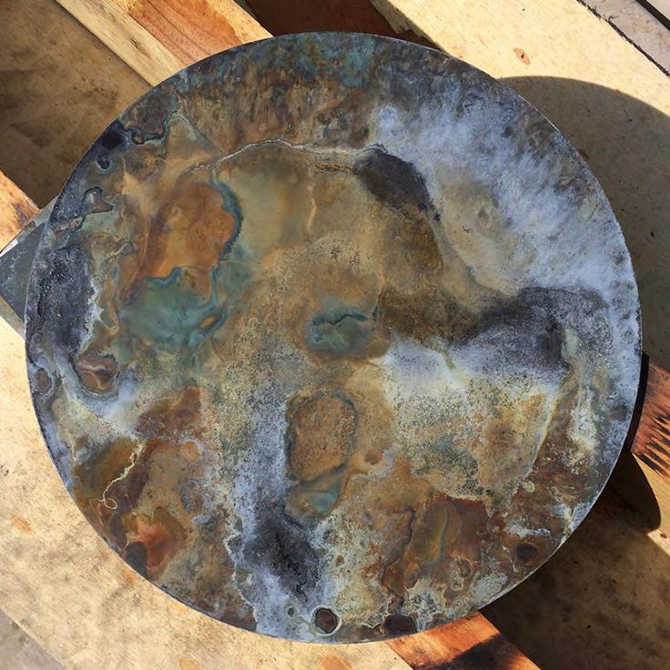 Patina Process From top left to right and bottom left to right, the different stages of patina used on a steel circular cut-out for the ‘Thin Chair’. A chemical process etches patina into the material allowing for a different quality of finish at different intervals in the process.