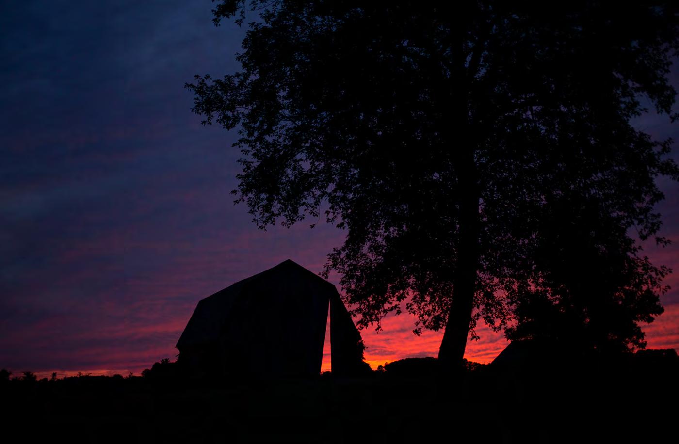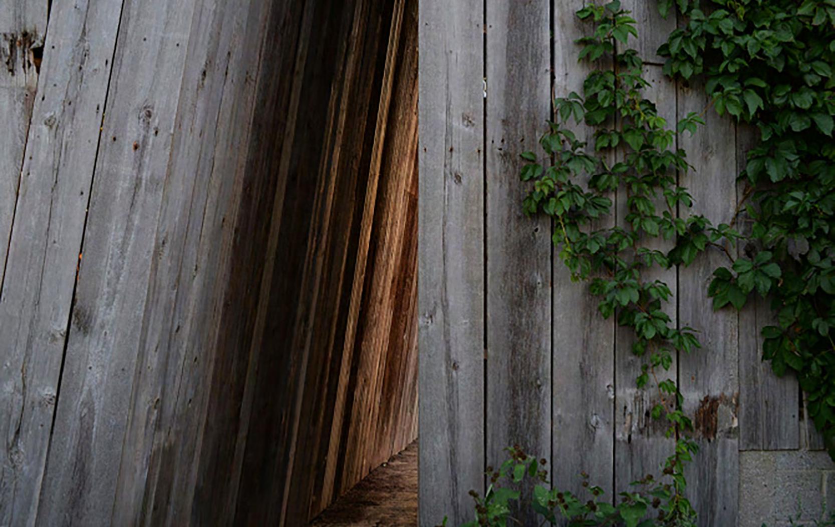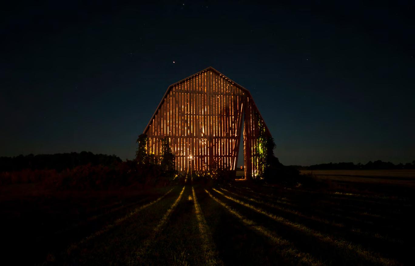 “‘Secret Sky’ is the structural reworking of a barn to allow the sky to enter and pass through the building. By day, the barn is noticeable for its patterning and intricacy and a massive cut with light pouring through it. At night, the work glows from within acting as a lantern in the landscape and casting long shadows on the ground that surrounds it, giving it back to the sky.” (Catie Newell)