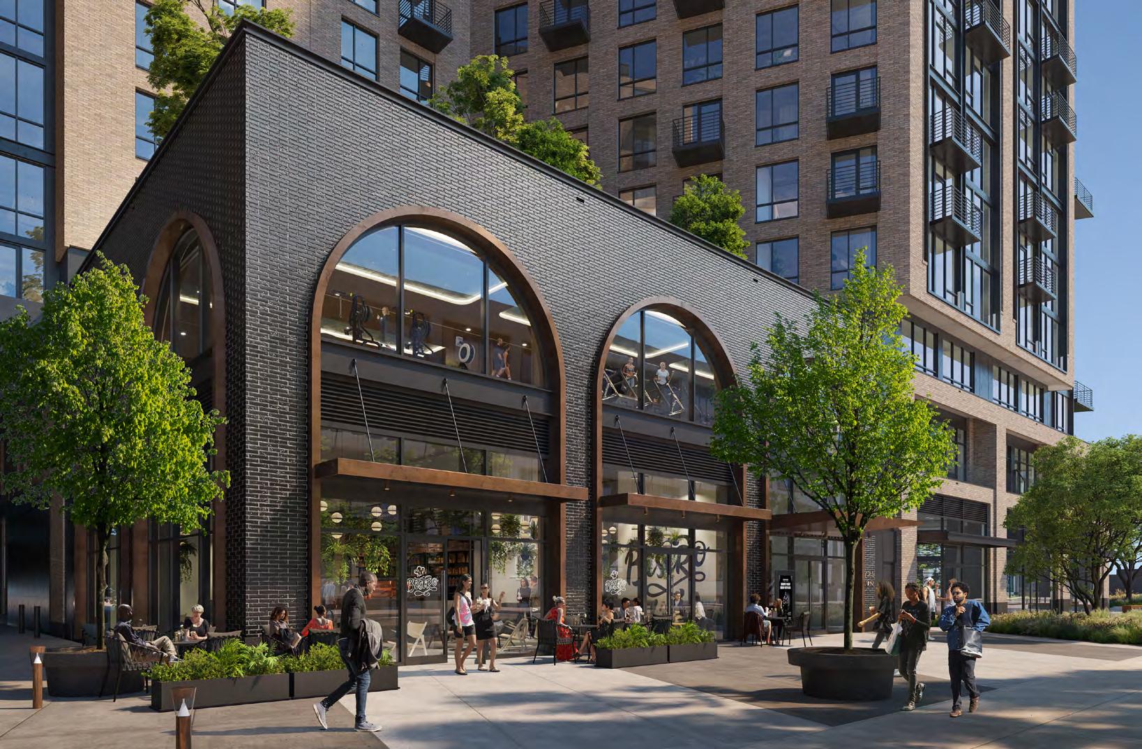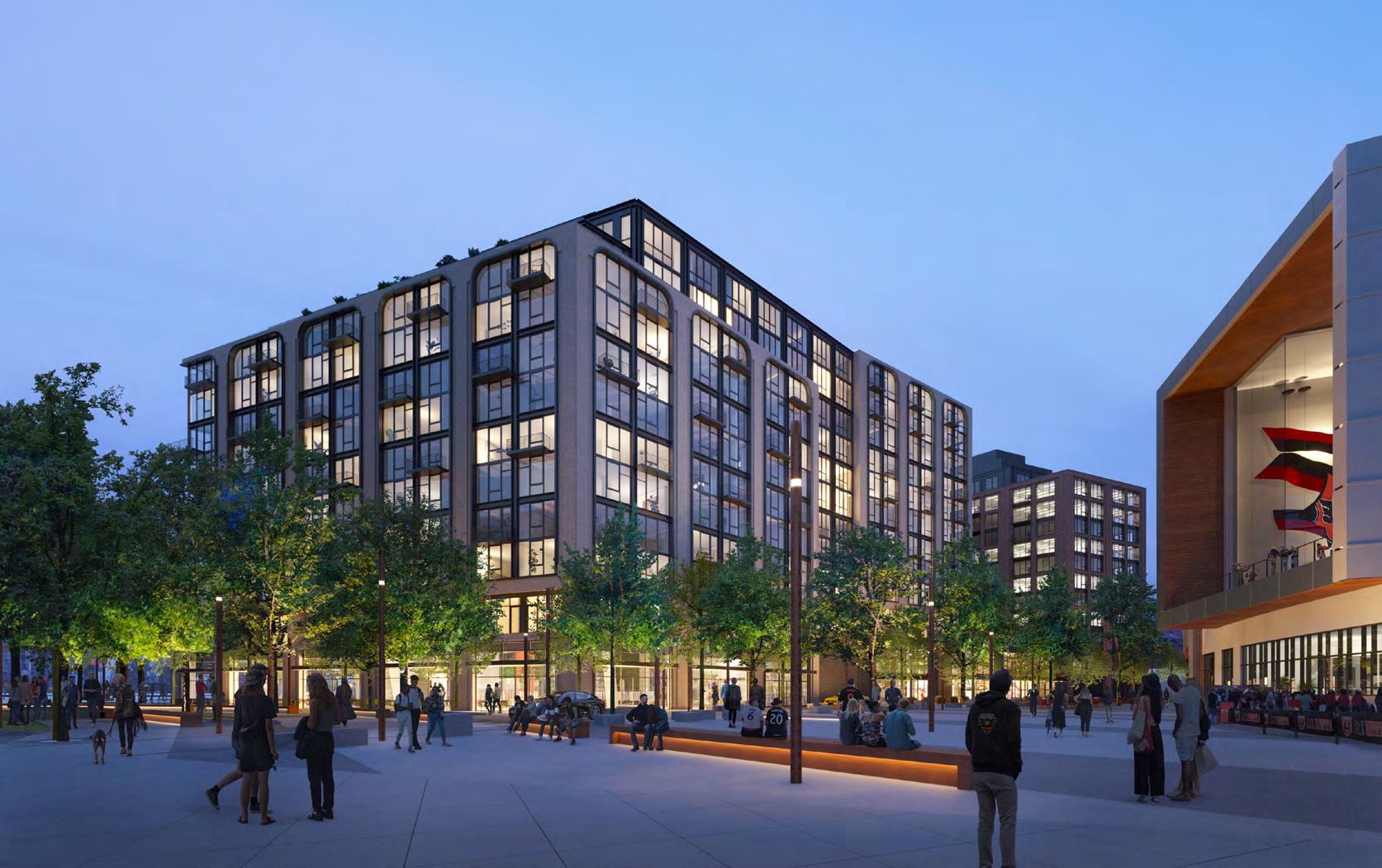The 508,000 SF development is designed to achieve LEED Gold and includes 334 market rate units (including 10% affordable), 111 affordable senior housing units, Veterans of America headquarters office, ground level retail, a bowling alley / concert venue, and 1 acre public park space.