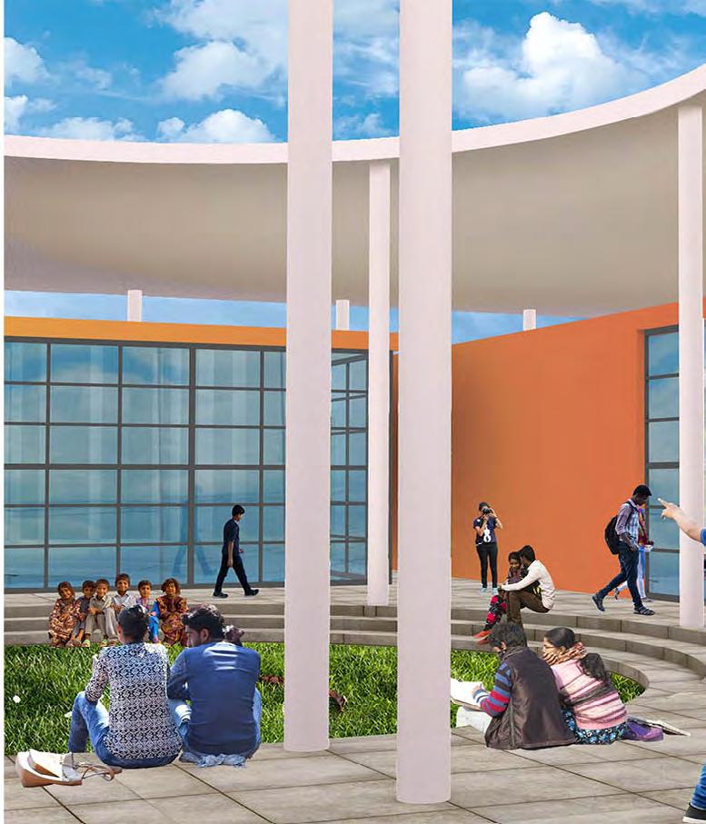 multi-purpose meeting hall with a kitchen, staff offices, and support spaces. The space is designed to provide 100 children access to a variety of learning environments.’ - ACU