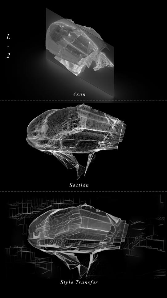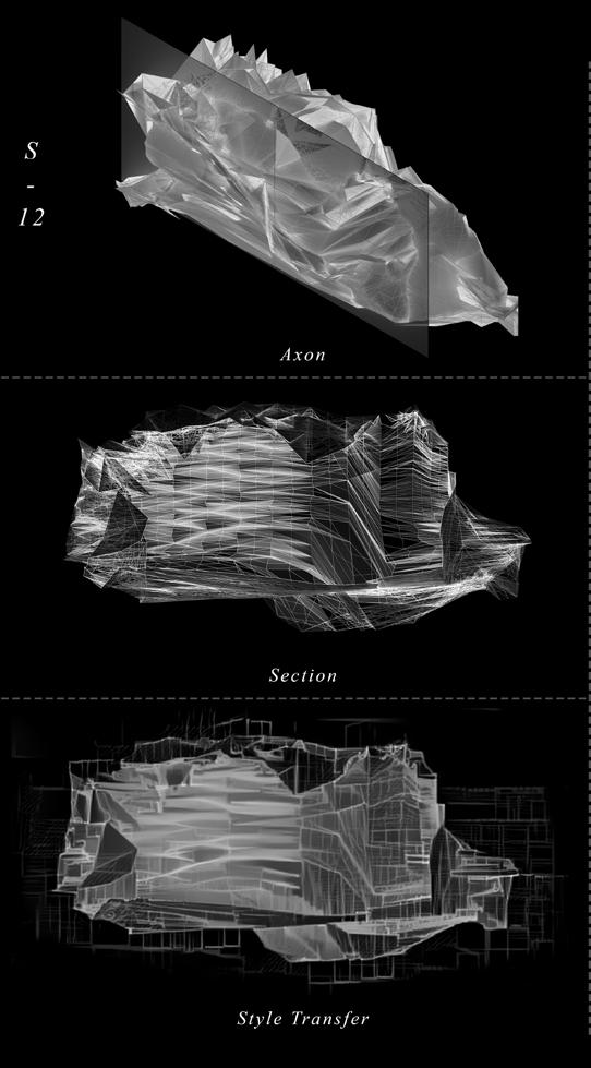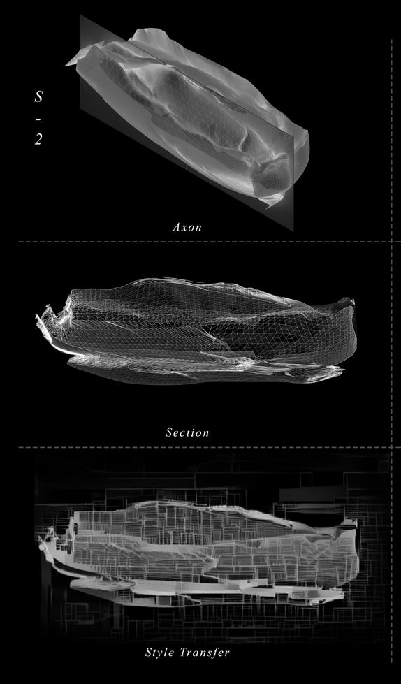 Style Transfer We used an AI-driven style transfer technique to combine sections from existing concert halls with sections from our AI-generated forms to project an additional layer of information that would help us imagine what the interiors of our newly generated concert halls may begin to look like.