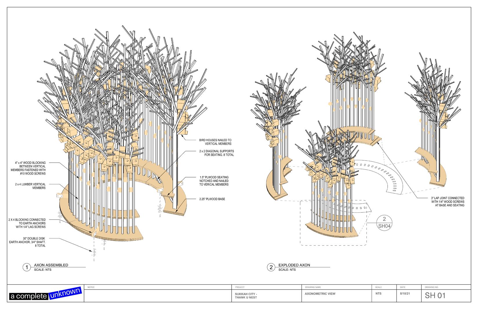 During the Jewish Holiday of Sukkot traditional Sukkahs act as temporary shelters for human inhabitants to rest, share meals, and sleep. ‘Thank U, Nest’ extends this space to our local and migrating avian friends.