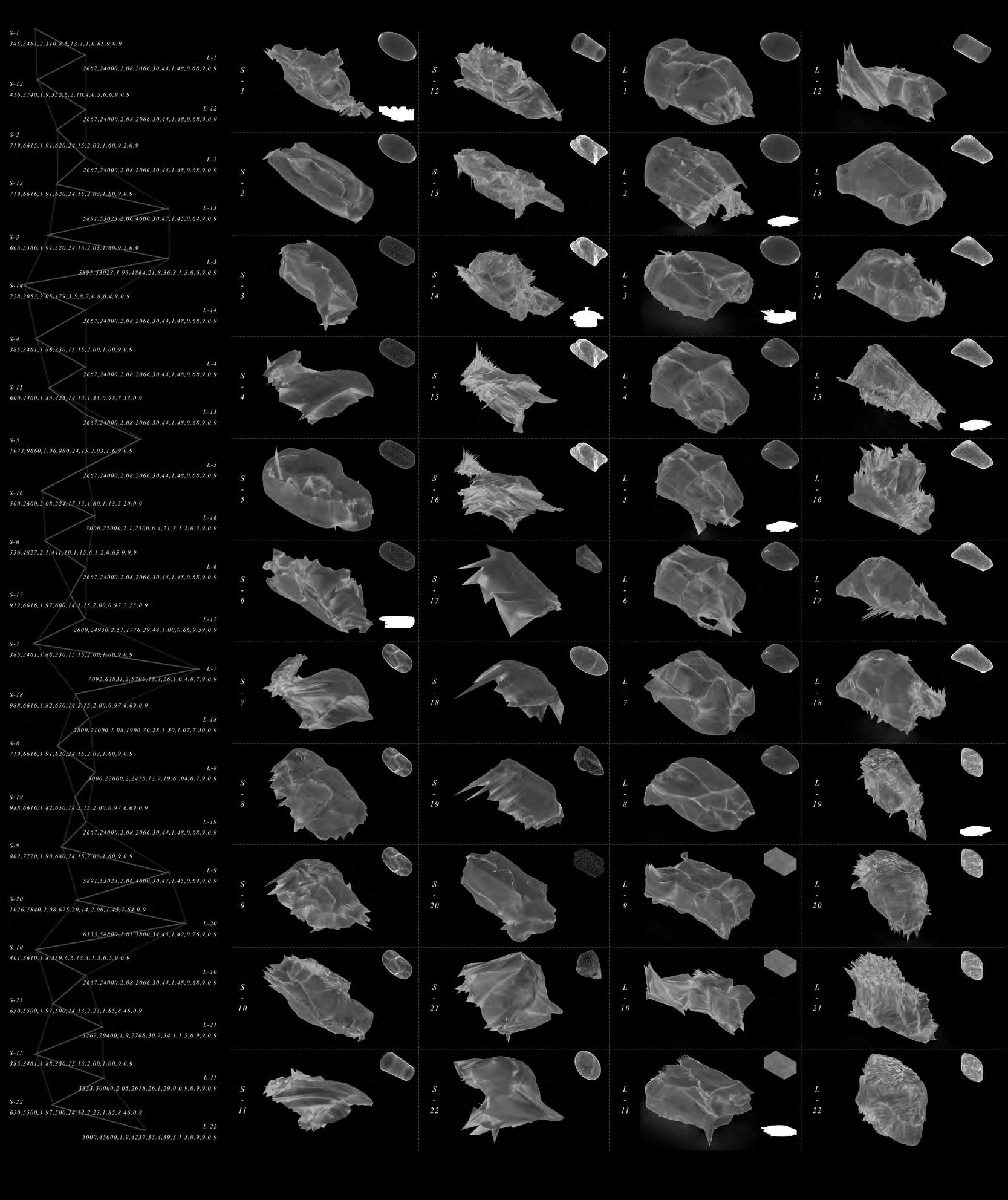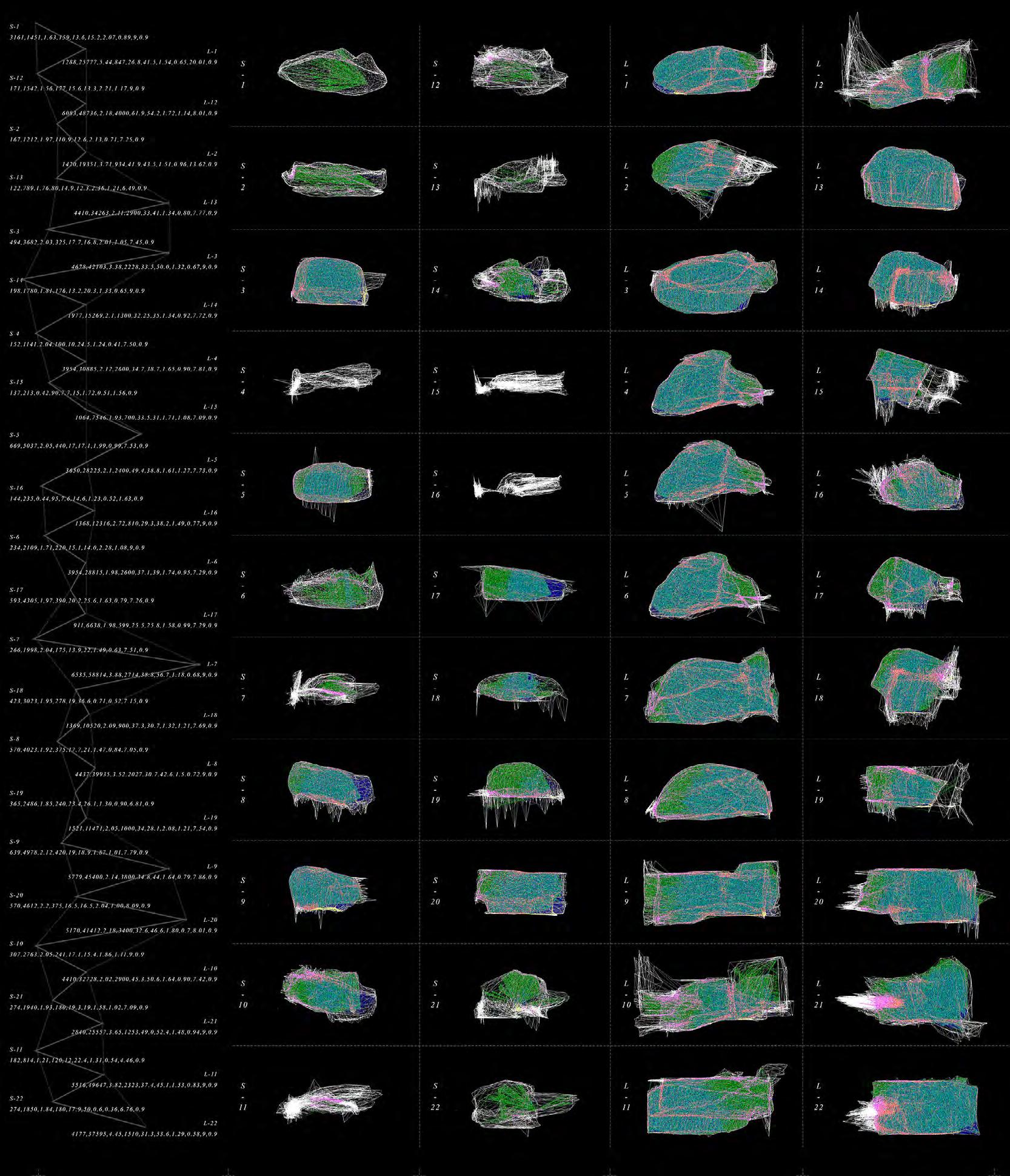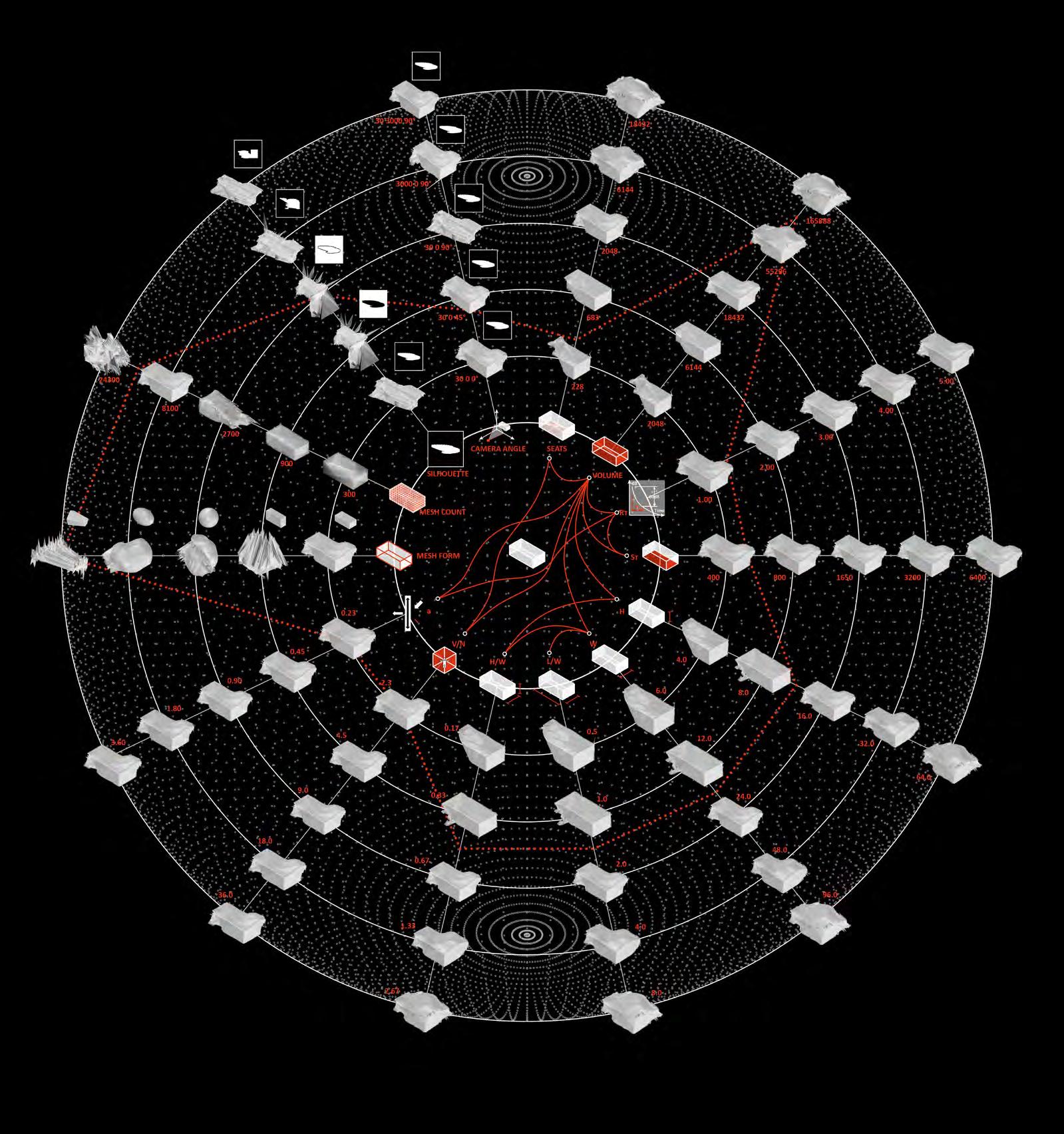 Simulation Matrix 44 results from Ecotect’s acoustic simulation software. The performance of sound waves is visualized through simulated particles. A range of successful and unsuccessful results can be seen, demonstrating how sound travels within the forms generated by our Graph Convolutional Neural Network.