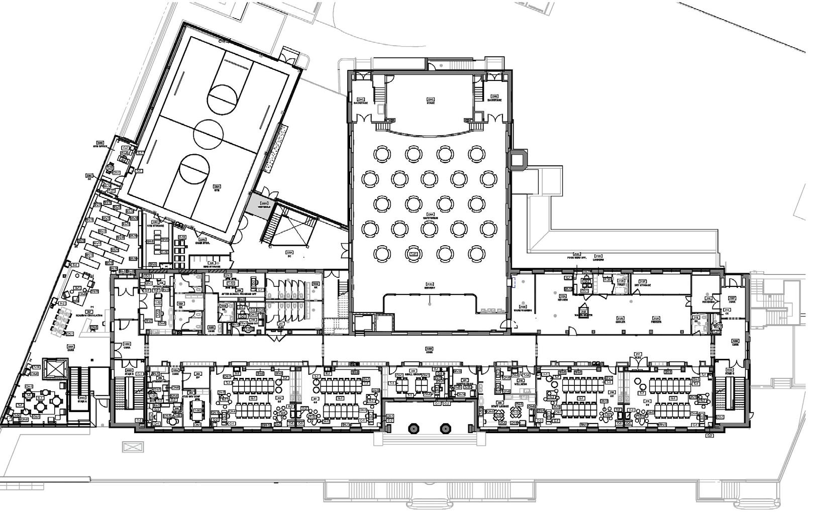 The project included a gut renovation of the original historic building and a program requiring a 30% increase in classroom/admin space, a new accessible entry, library, and gym, while maintaining existing elements important to the parent/student community, such as the outdoor track and soccer field.