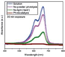 Figure 3. Absorbance of methylene blue solutions: as prepared (10mg/mL); after UV light irradation ( λ=366 nm); after dispersion of powders from crushed foam and separation; after mixing with powders, UV irradiation and separation [powders extracted with a magnet]