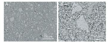 Figure 1. 8M activation: overall view (A), larger magnification detail of individual CMG particles surrounded by porous gel matrix (B)
