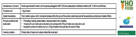 A preliminary LCA study conducted from July to October 2022 (Fig 3) is focused on the pasteurization fresh cut melon at small scale (pasteurization chamber 4L). Coherently with the ISO 14040-44 standards, the goal and scope of LCA have been defined, including all processes “from farm to fork” , to quantify environmental impacts associated to the lab scale plant in terms of global warming, ozone depletion, ecotoxicity, acidification, eutrophication. e main assumptions in preliminary LCA study of melon are summarized in table 1.