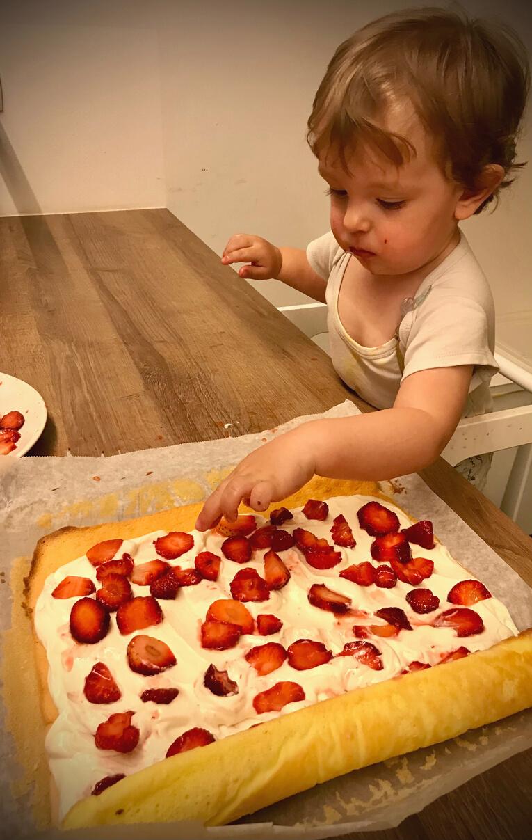 Ohlajeno rulado odvijte. Namažite jo s kremo, posujte z jagodami in ponovno zvijte. Po želji potresite s sladkorjem v prahu.