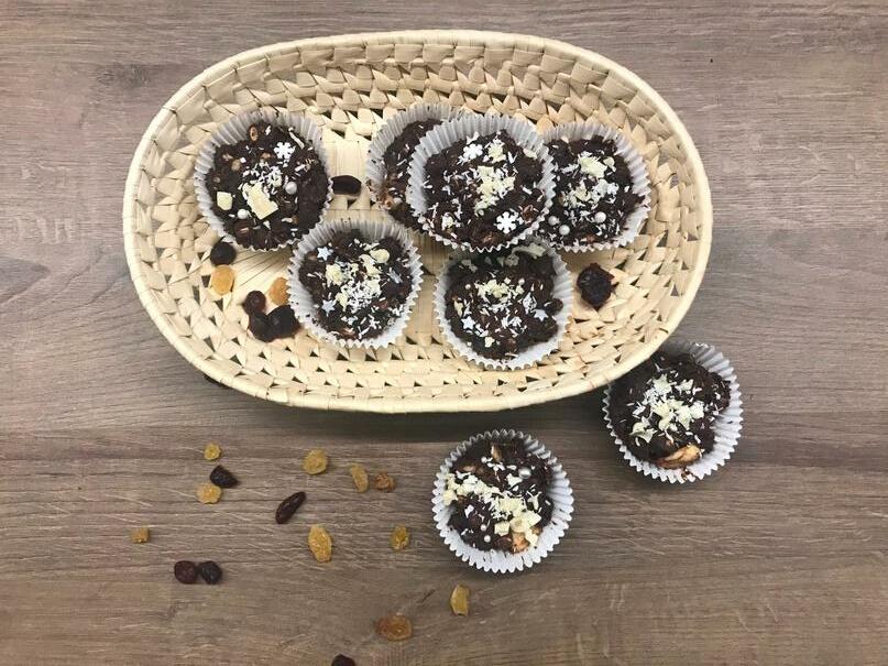 (po želji) čokoladne solzice ali suhe brusnice, rozine