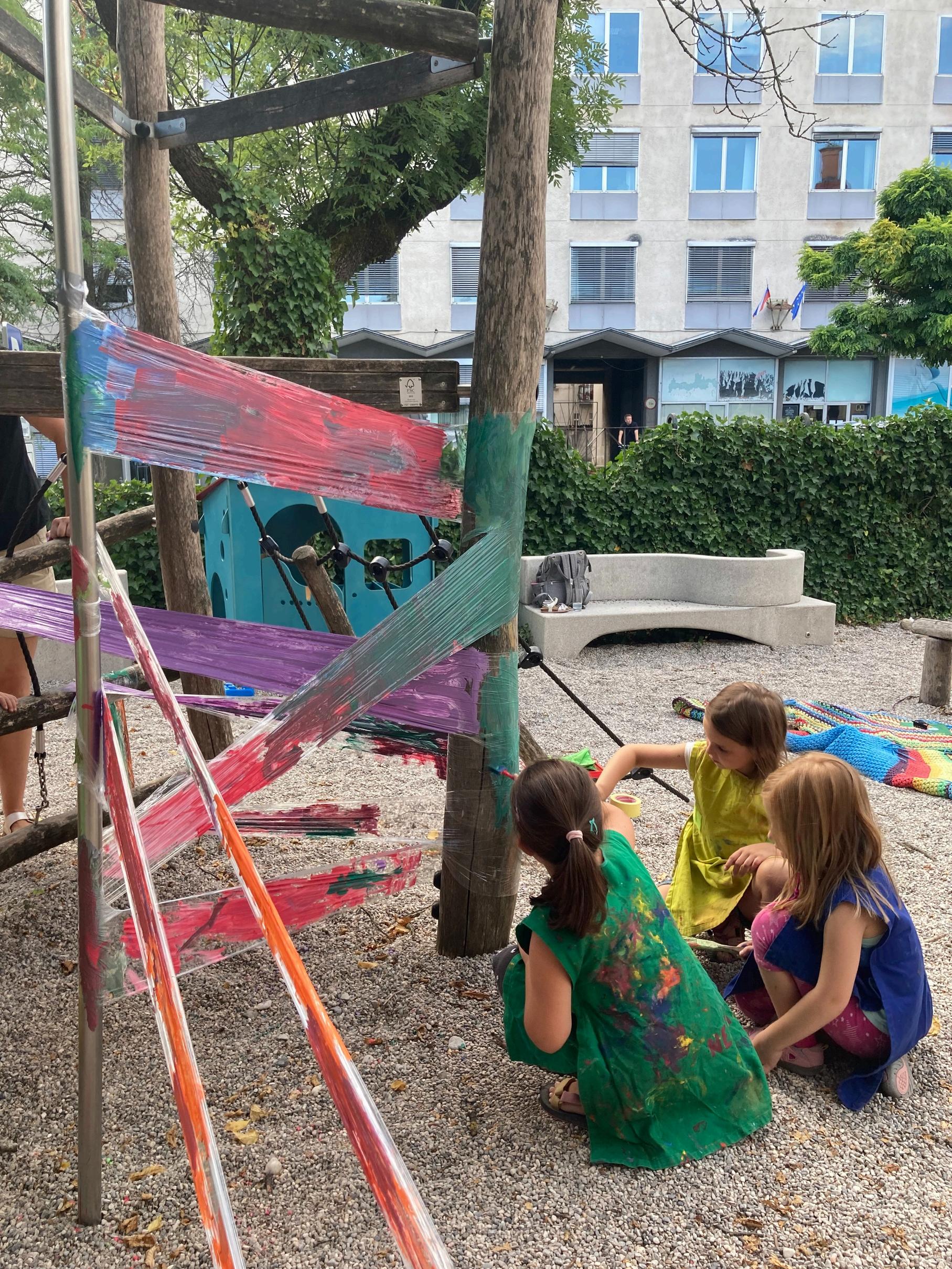 Zaključene nize obesi v prostor. Navežeš jih lahko med drevesa, stebre, ograjo, med posteljo in stoli itd. Če nimaš ustreznega prostora za navezovanje, v zemljo zapiči palice različnih oblik in rolice nanizaj nanje.