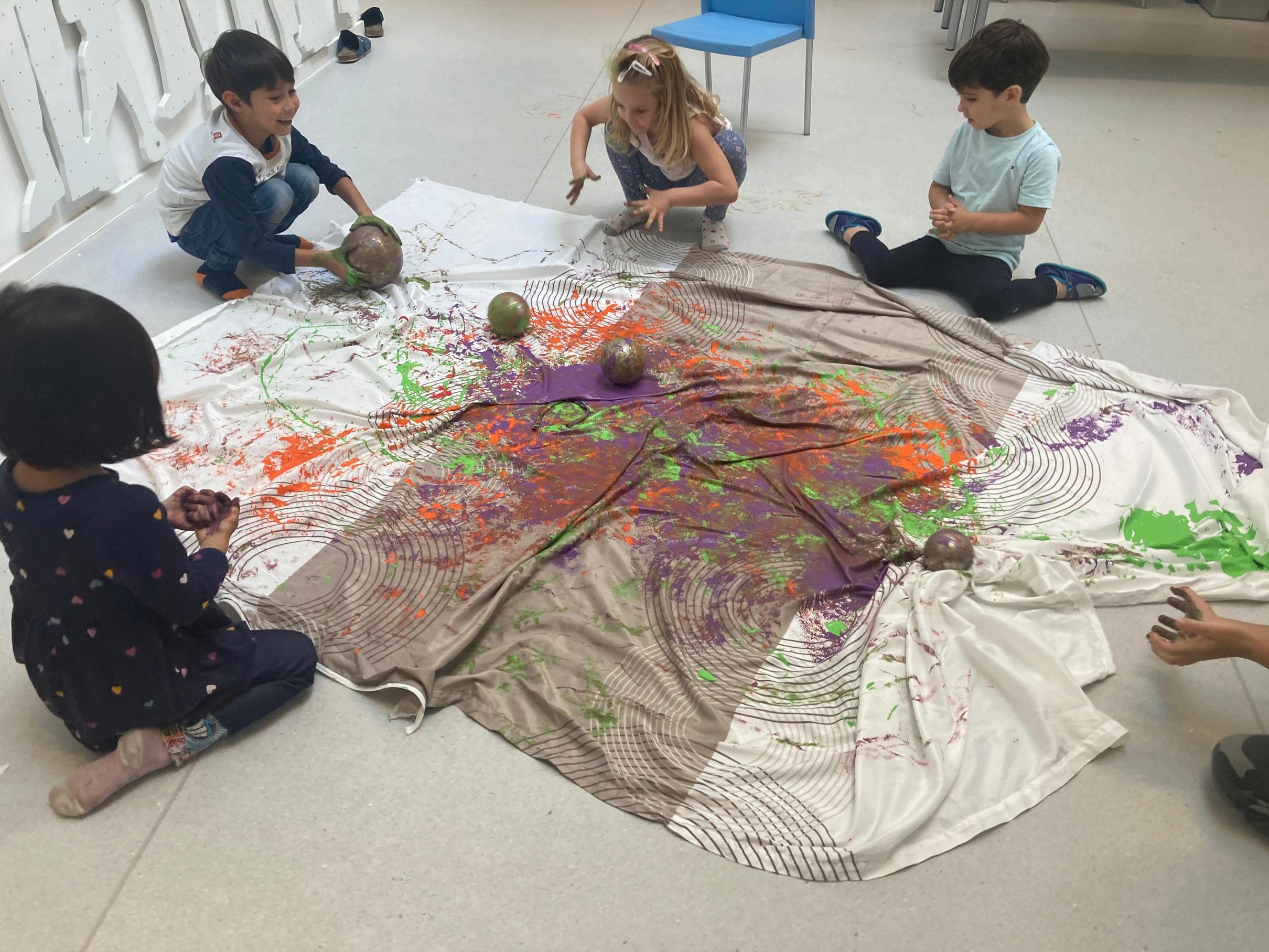 velik kos papirja, različne žoge, tempera barve, zaščitna oblačila.