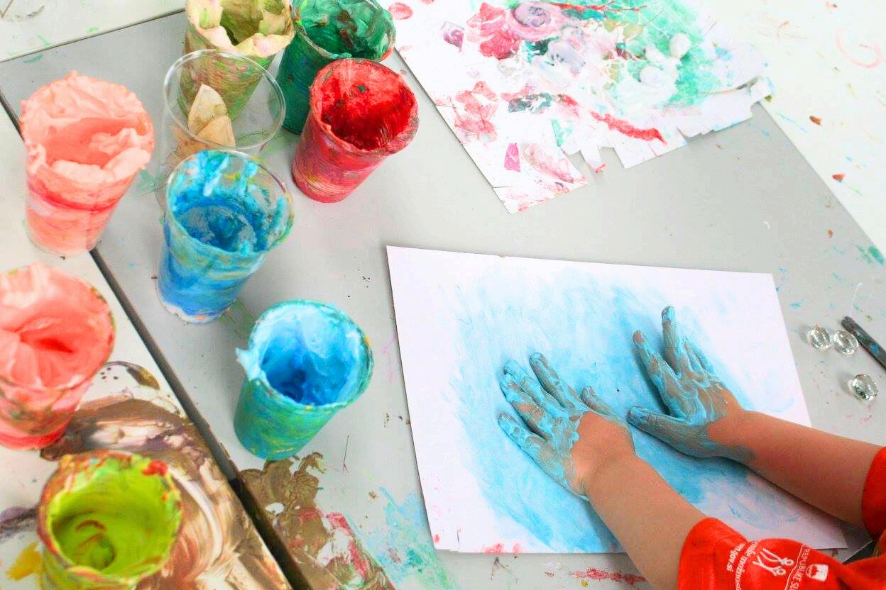 S tako pripravljeno barvo lahko slikaš s čopiči ali z rokami. Pri nanašanju raziskuj različne možnosti. Barvo razmaži, udari po barvni packi, nanesi debelejše plasti, čez njih s prsti naredi različne sledi …