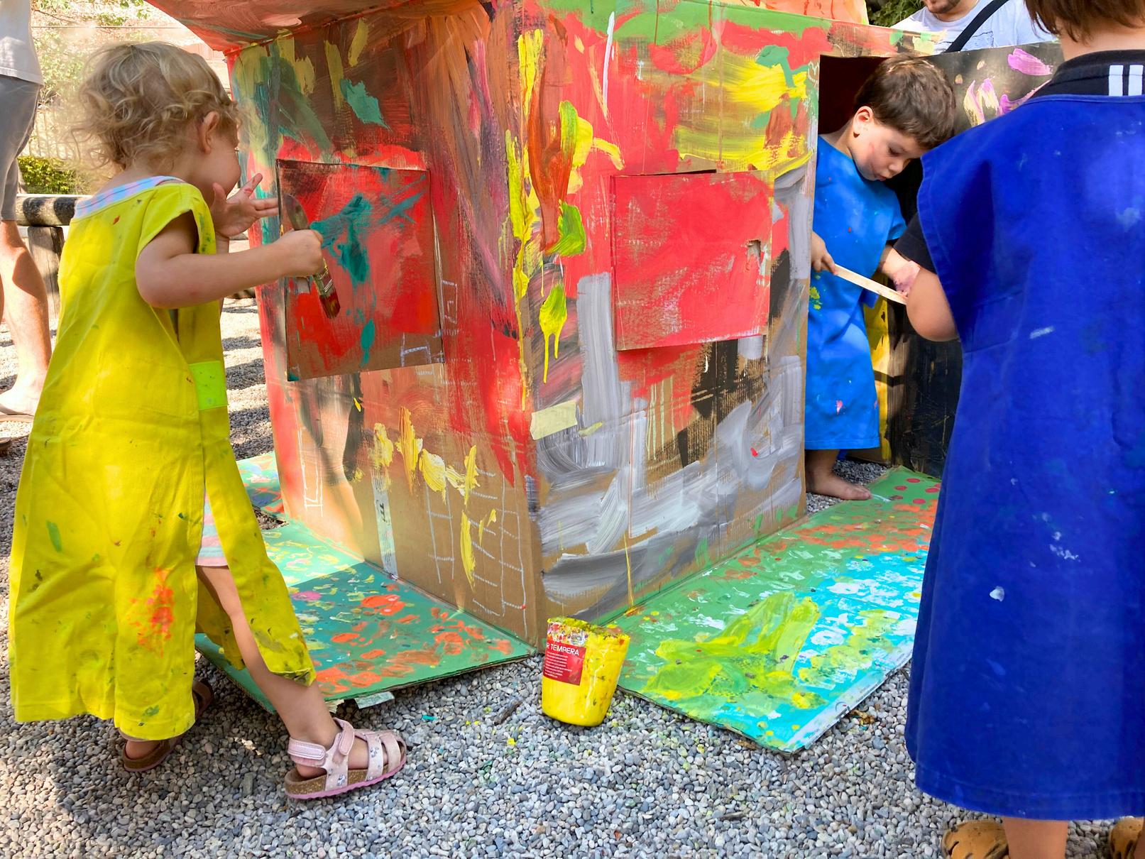 Potrebuješ: škatle, kose kartona/lepenke, lepilo za papir, širok lepilni trak, tempera barve, različne (slikarske in pleskarske) čopiče, kozarec za vodo, zaščitna oblačila.