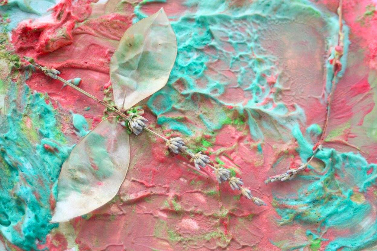 Na koncu na debelejše dele slike brez lepljenja umesti raznolik naravni material. Pri izbiri bodi pozoren/a le na to, da je material lahek, sicer bo s slike odpadel (npr. posušeno cvetje, listi …).