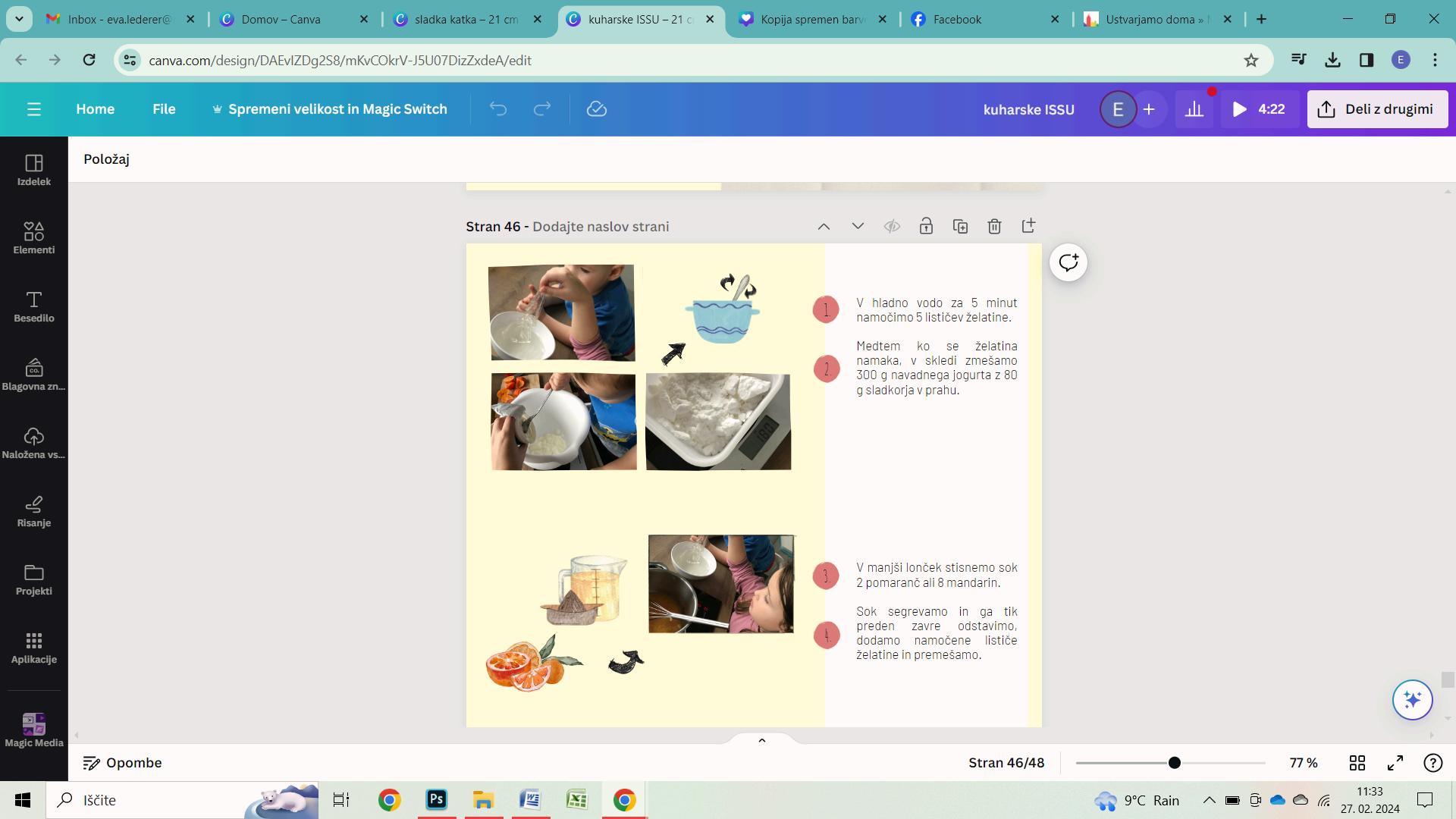 Izberi model, v katerega boš vlil/a želatino. Uporabiš lahko modelčke za piškote, krožnik, manjši pekač, kozarec … odvisno od želene oblike. Želatino pripravi po navodilih na vrečki. Najlažja je priprava želatine v prahu, ki jo le zmešaš z vodo.