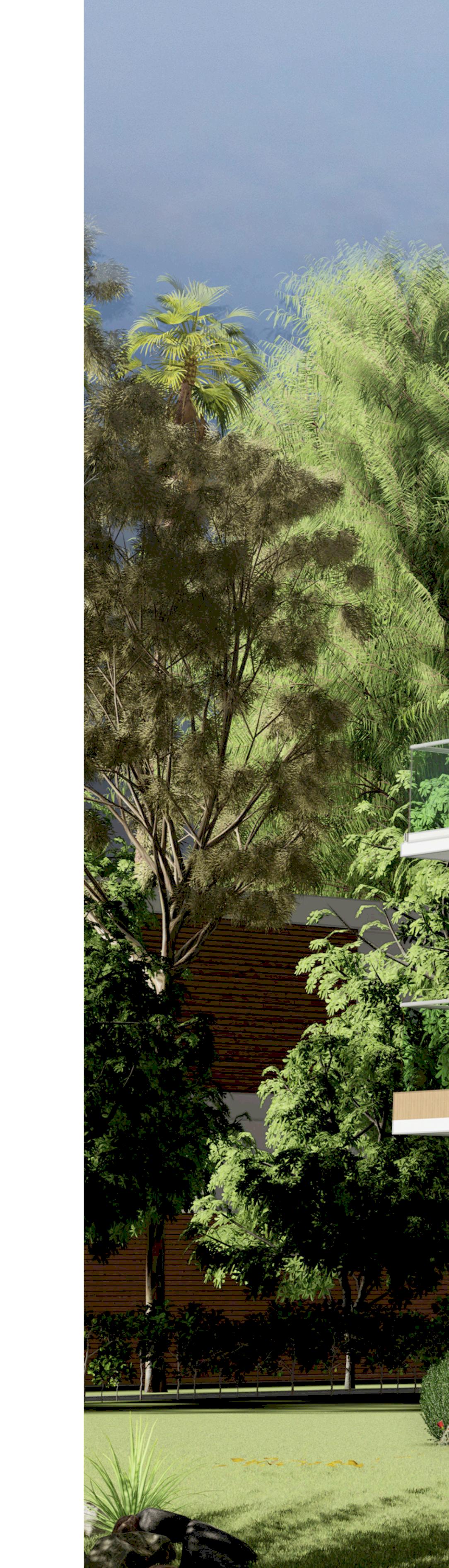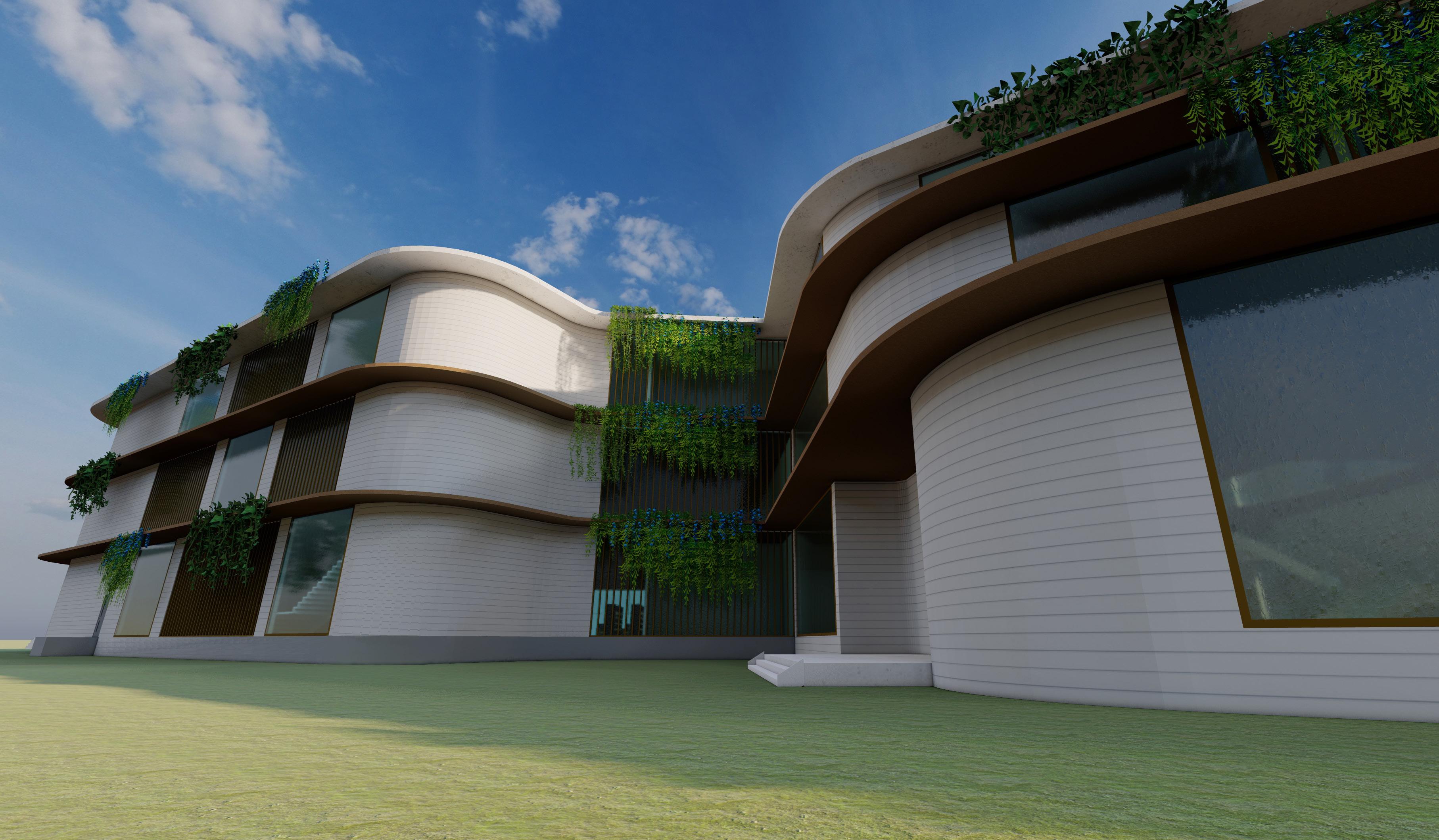 Different levels created de scending upwards creating a step effect. Green roofing add ed to levels to give a cooling efect visually and physically