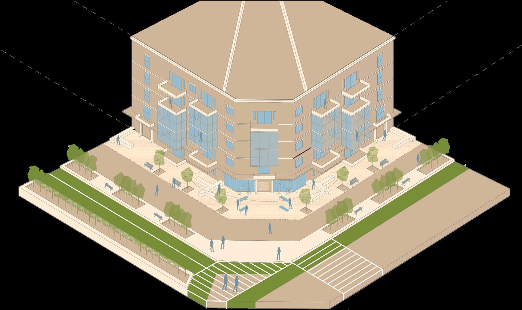 chamferred building corner can increase sidewalk visibility and allow ample space for informal, spontaneous interactions to occur amongst neighbors