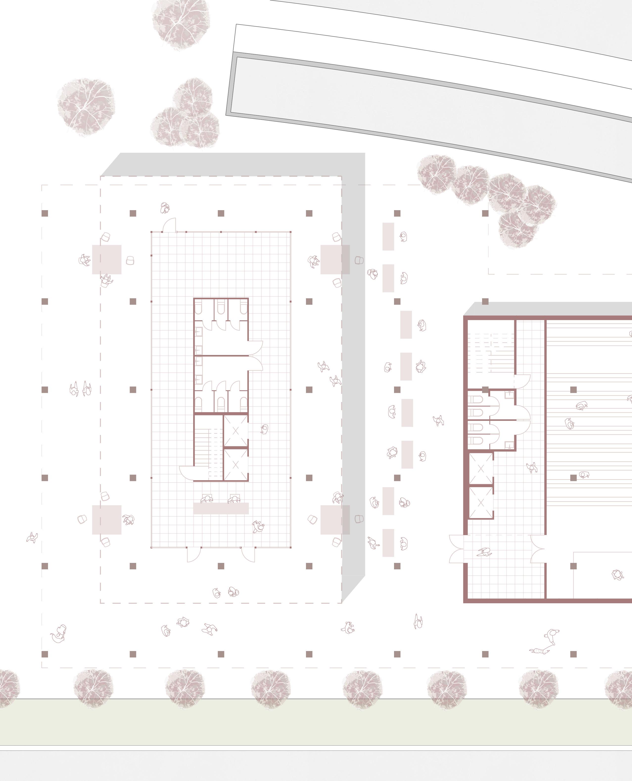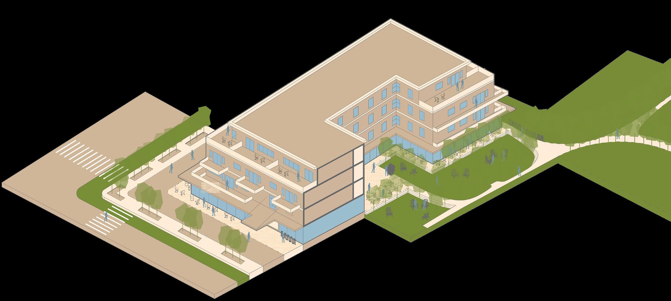 compression of walkways from the greenway into the courtyard signals a semipublic gathering space for residences of the building