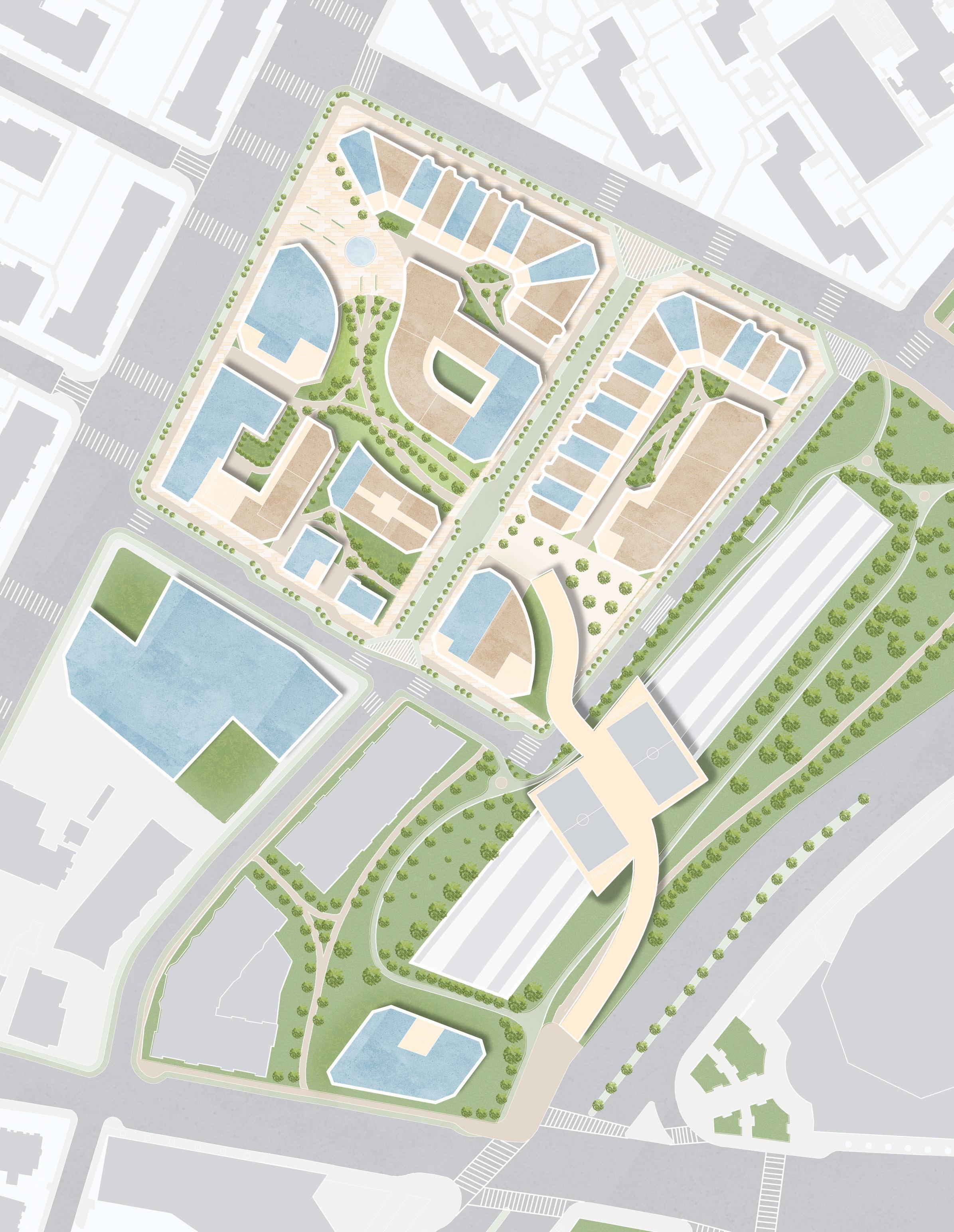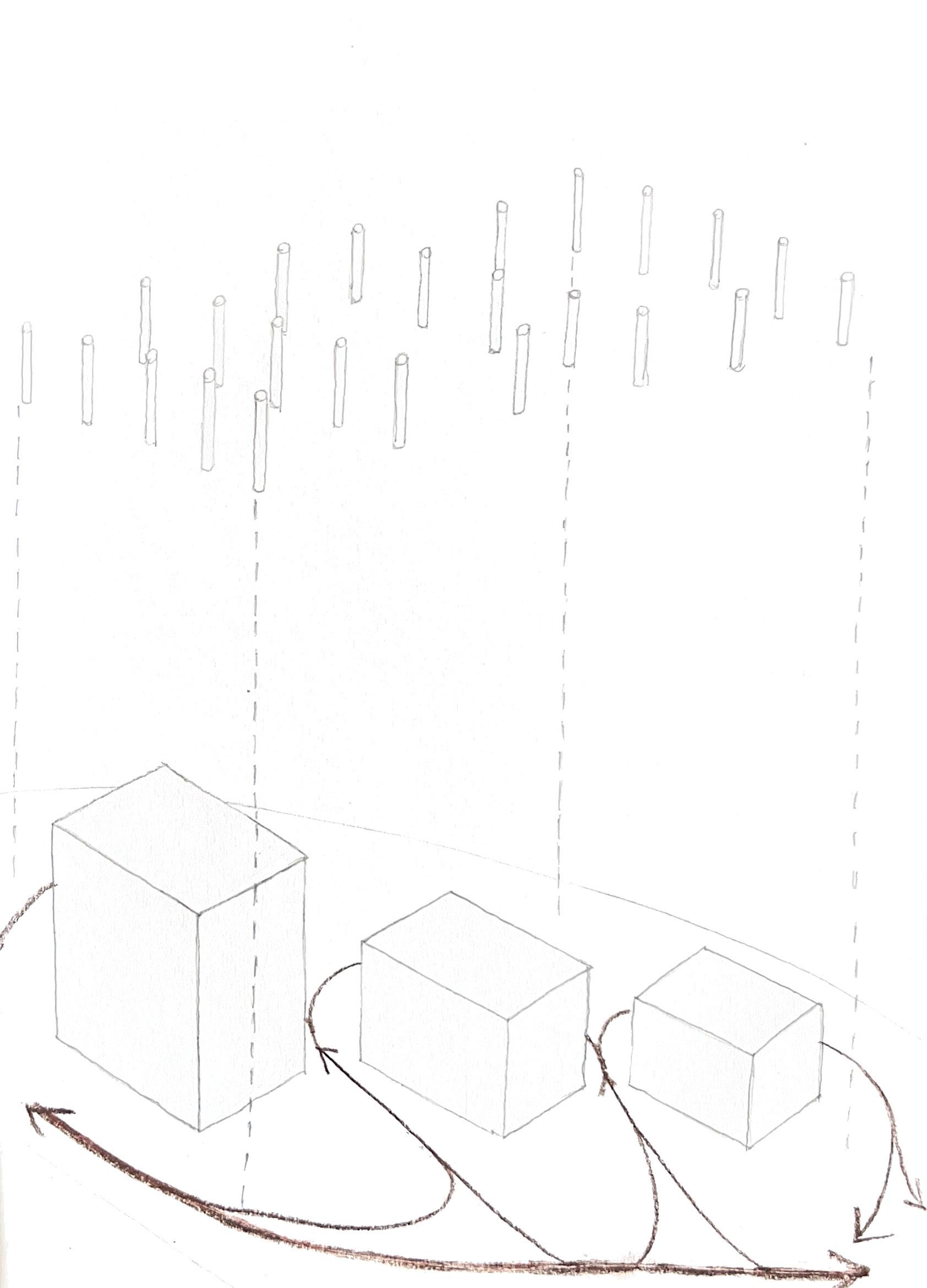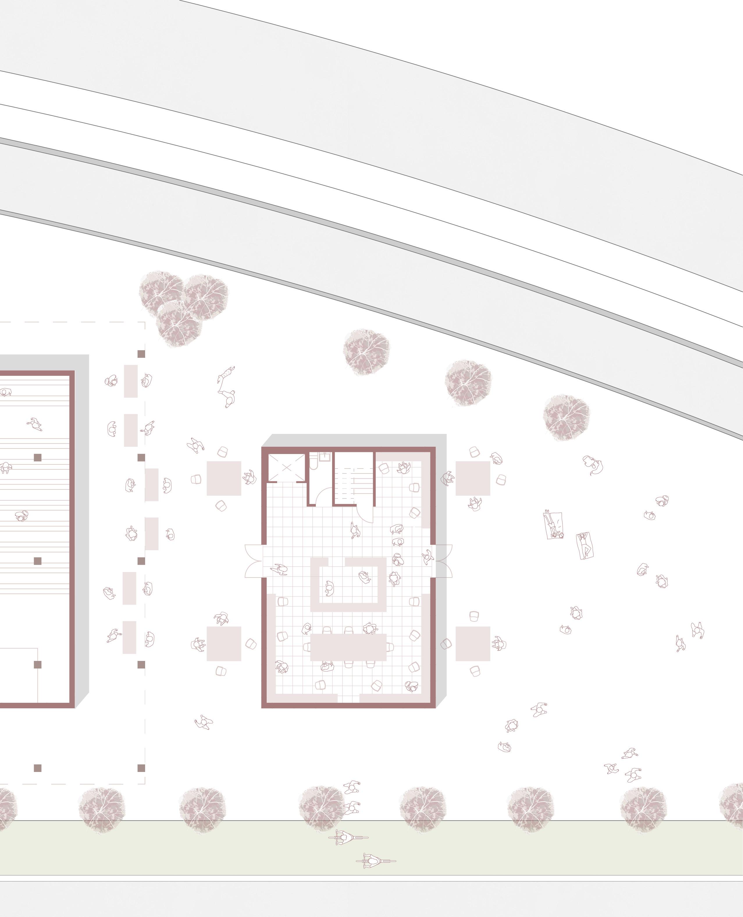 a field of columns occupy the inbetween spaces of the site to host a marketplace that draws users deeper into the oddly shaped site