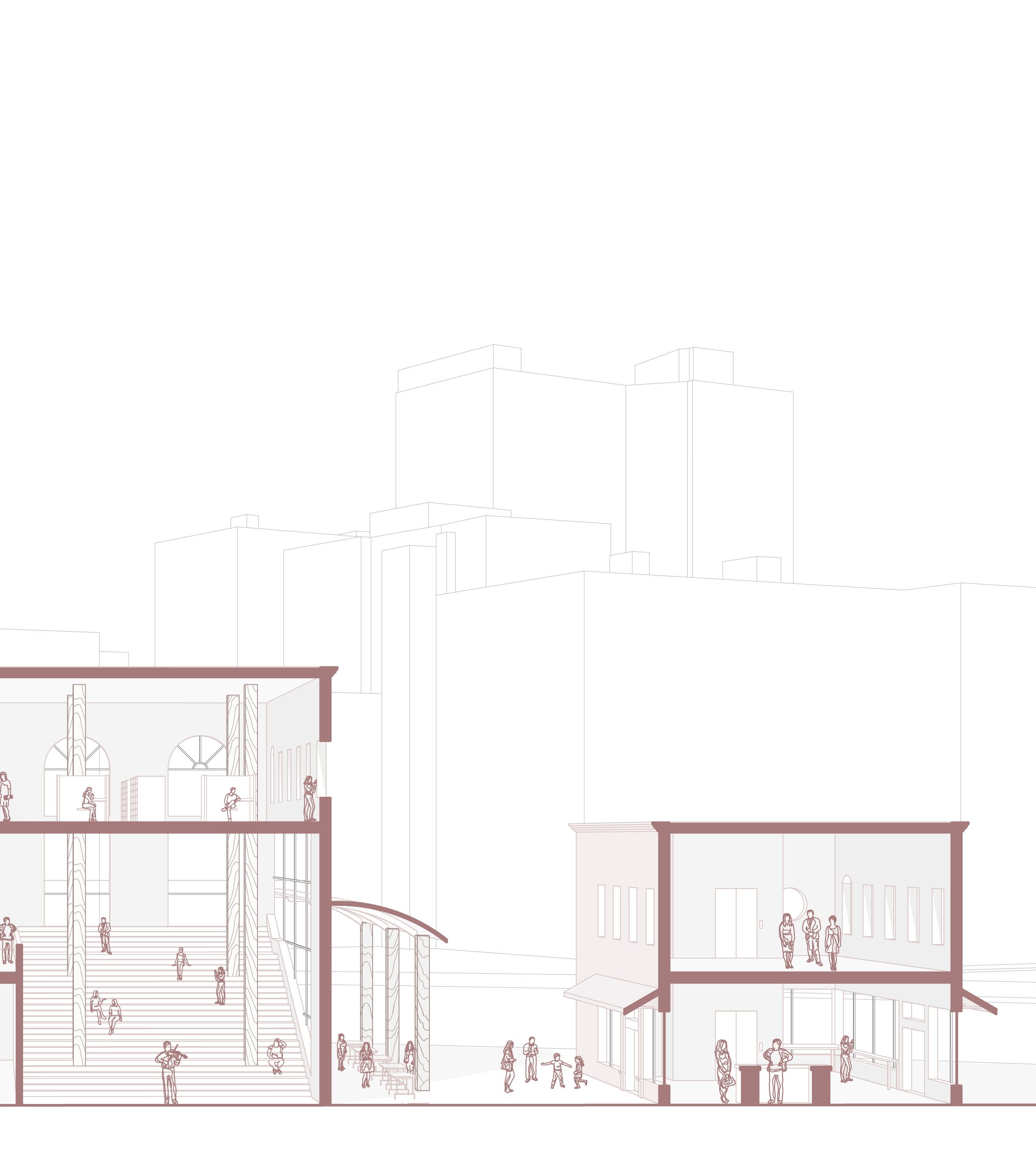the center stone of Boston’s vibrant Upham’s Corner neighborhood, the Strand is a 20th century theater with a bright past and an uncertain future. two additions on either side of the Strand would serve as programmatic and financial buttresses linked by a new, looped circulation pattern. in returning patrons to the Strand, these additions reactivate the theater and provide space for exhibition, reflection, and community.