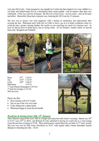 Photos (by Mo) • Ryan running well at 8 ½ miles • Sue on one of the very wet roads • Colin sliding into a sprint finish • Philomena happy to reach the last hurdle