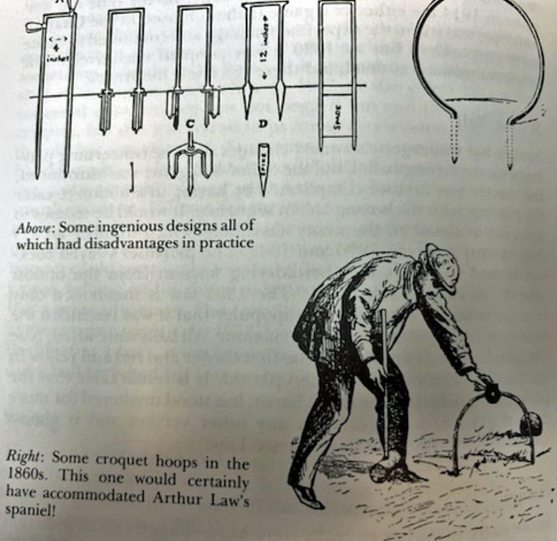 Speaking of hoops: D.C.M. Pritchard in his “History of Croquet”; Cassell 1981 describes hoops in use in the 1860s. They were “hoop-shaped and so wide that Arthur Law had a spaniel so trained that, when placed at the starting point and tapped with a mallet, it would go through all the hoops in order until it reached the winning peg.”; a truly remarkable feat for a spaniel. The attached photo shows an illustration of the hoops that Pritchard describes.