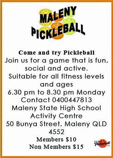 PickleBall every Monday 6.30p.m. to 8.30p.m. Maleny High School Activities Centre.