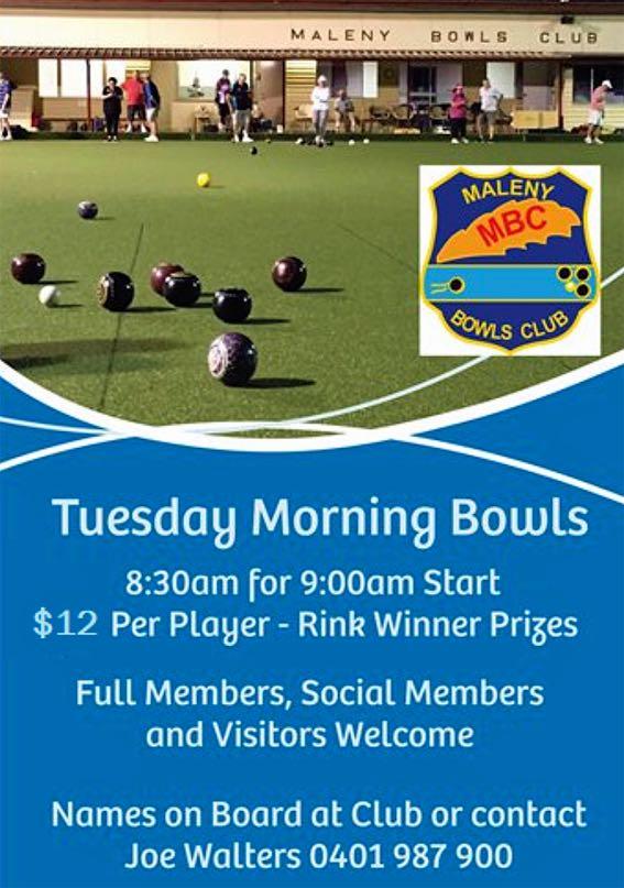 Maleny Bowls Club. – TUESDAY AM BOWLS, 8.30am for 9.00am . 2 games + morning tea $12 per player. Rink Winner Prizes. Visitors and players welcome. Call Joe 0401 987 900 to book your place