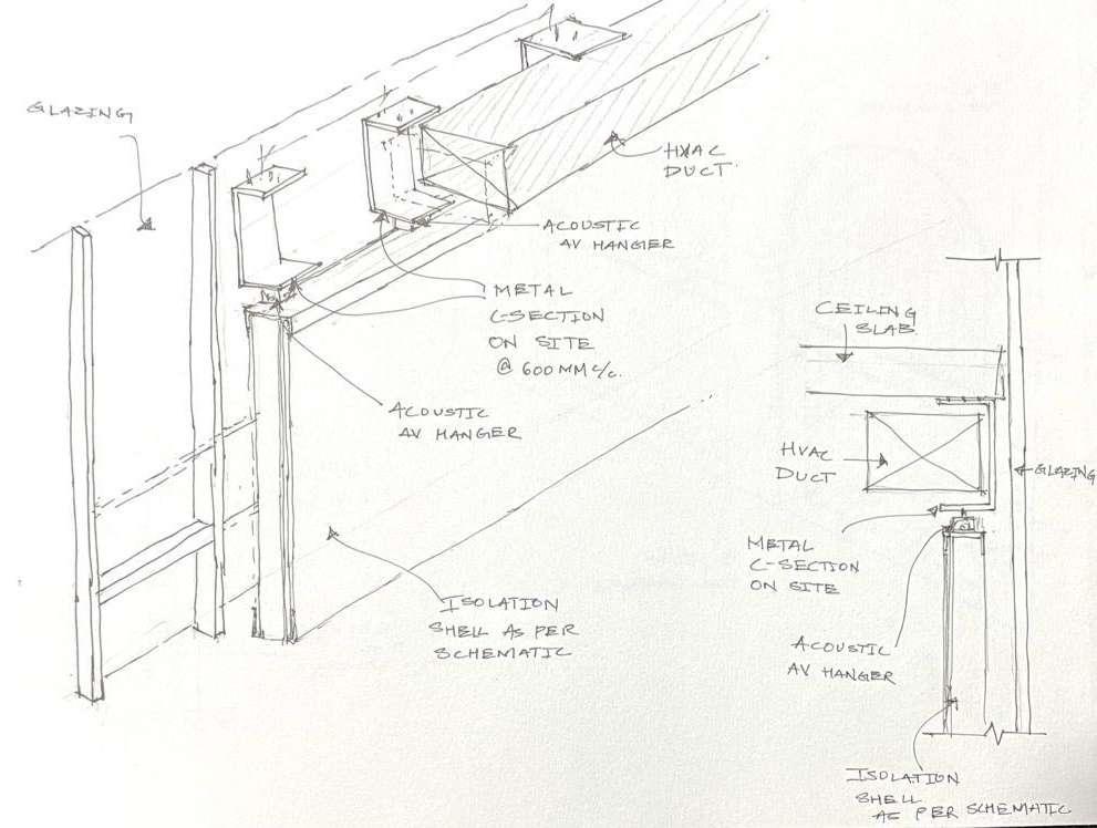 These are details for a project showcasing the structural assem bly for the partition walls and a design intent for an interior of a studio space respectively. Sketches are a great of communicating the design to the client OR a structural assembly to the execution team on the site.