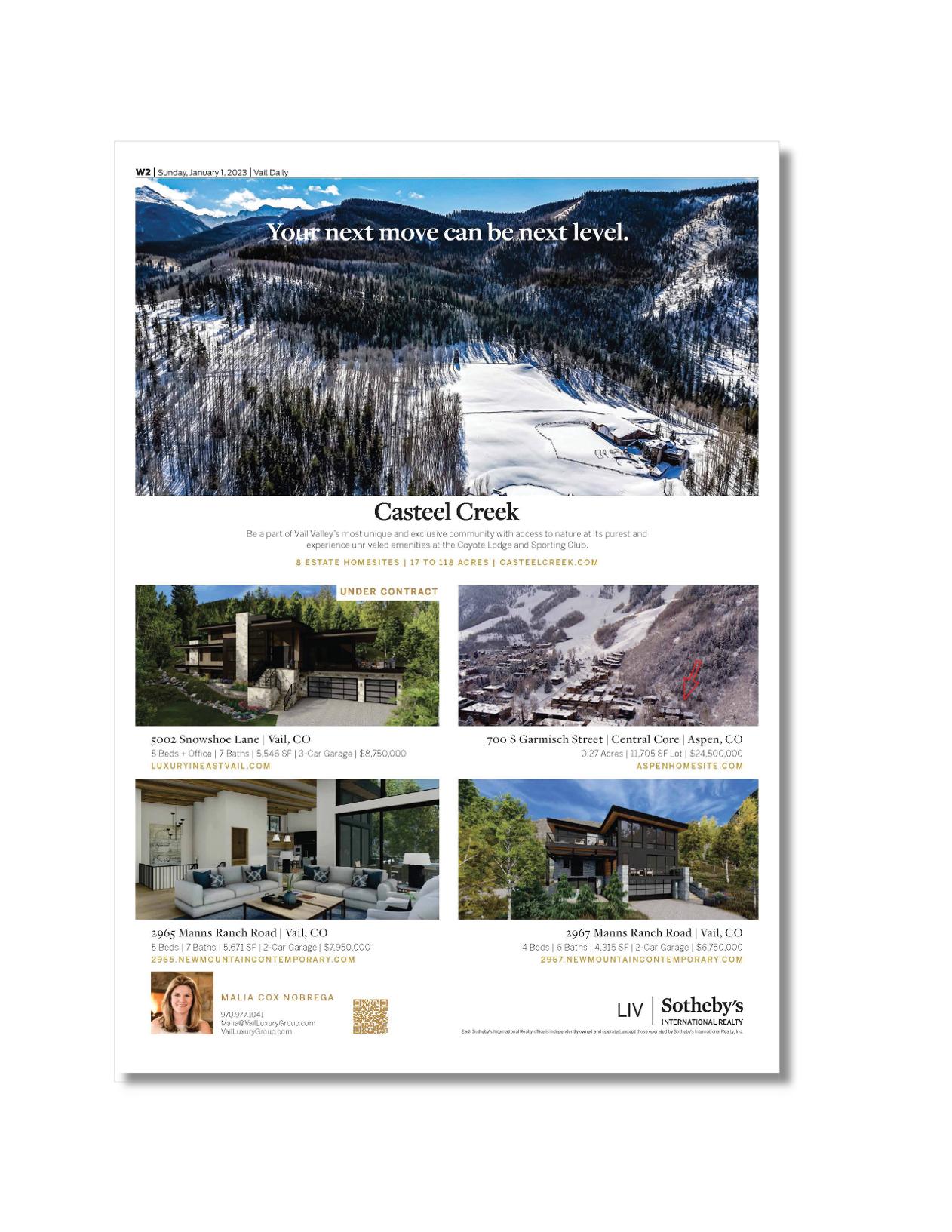 Malia then took Vail and Beaver Creek luxury real estate by storm,quickly recognized for her passion,intelligence, and candor.Her tech-savvy approach launched her to the top of luxury real estate culminating in her being named the2015 Outstanding Rookieby ?Who?s Who in Luxury Real Estate? Eight years later,Malia is the #1 producing real estate agent in the Vail Valley (which includes Vail and Beaver Creek Resort areas),the#10 producing agent in Colorado,the #173 producing agent in the United States,and was honored to benamed as a Top 100 Sotheby?s International Realty agent worldwide for two years in a row,sincethe beginning of thehonor *