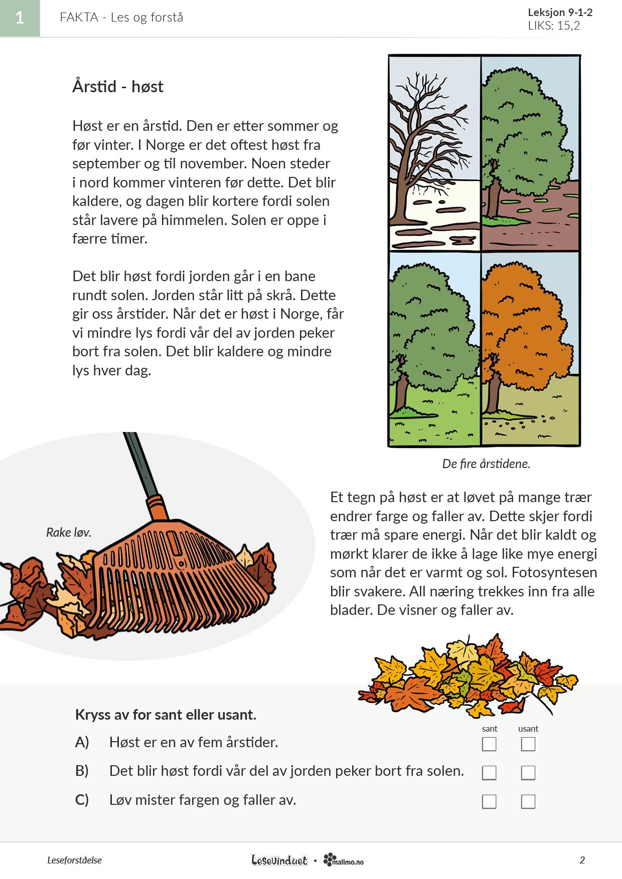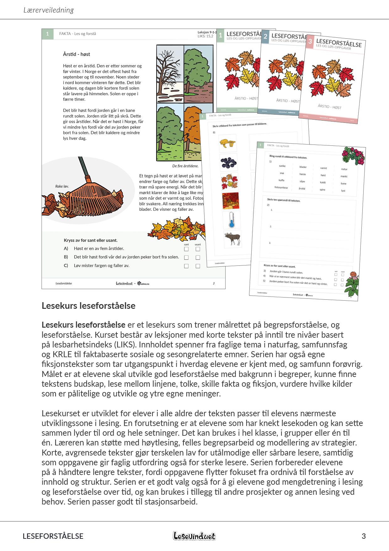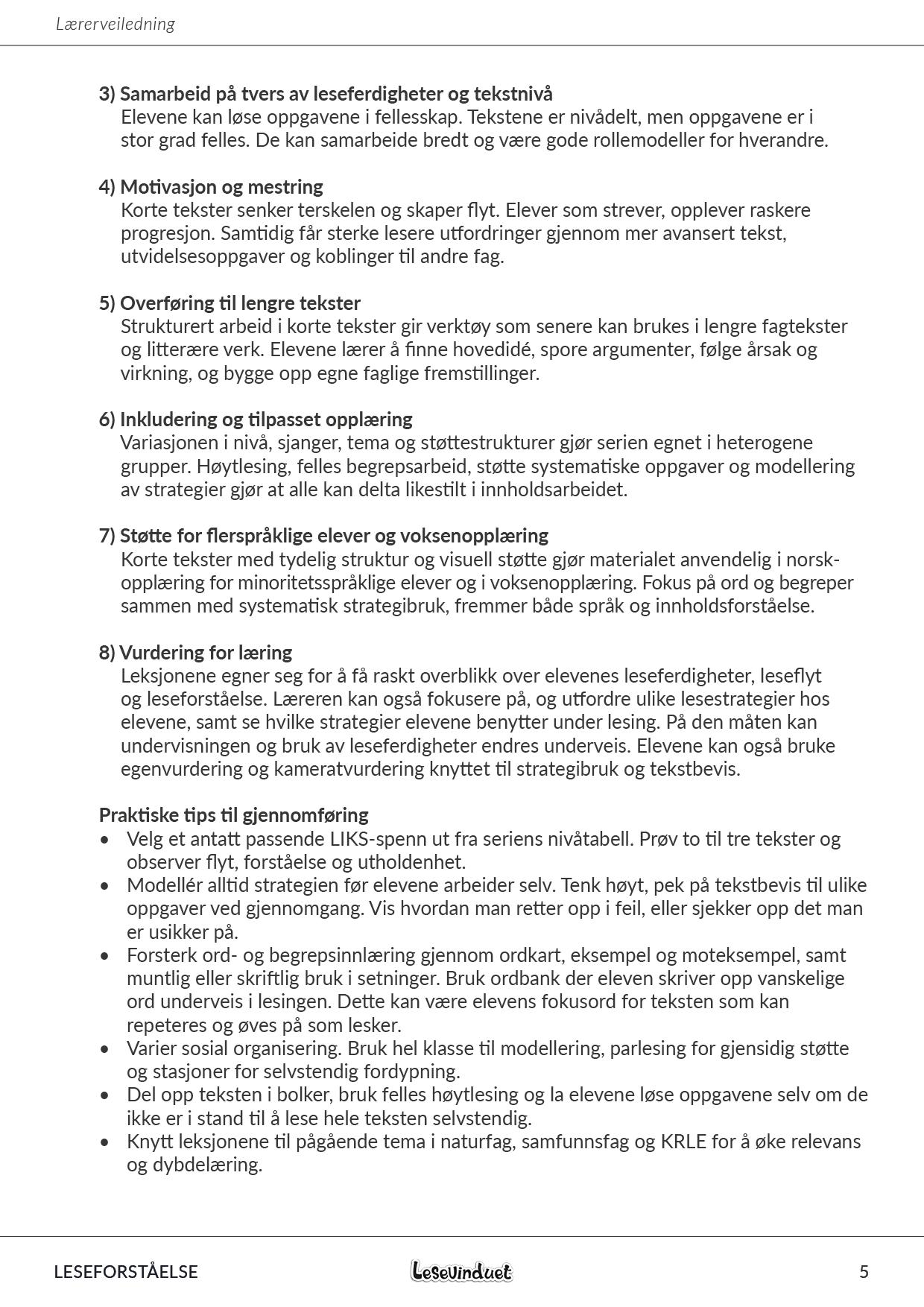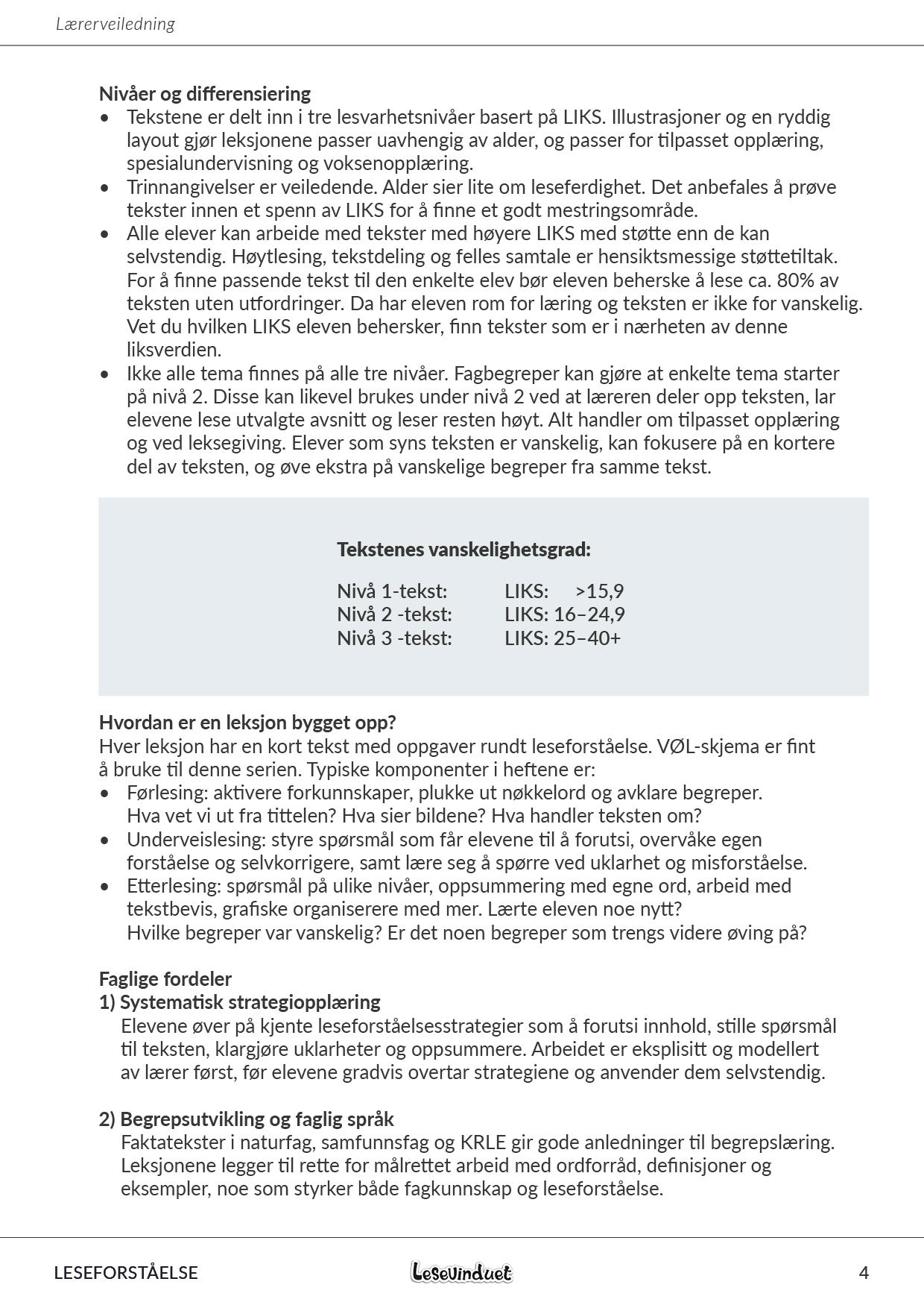 • Tekstene er delt inn i tre lesbarhetsnivåer basert på LIKS. Illustrasjoner og en ryddig layout gjør at leksjonene passer alle aldere, tilpasset opplæring, spesialundervisning og voksenopplæring.
