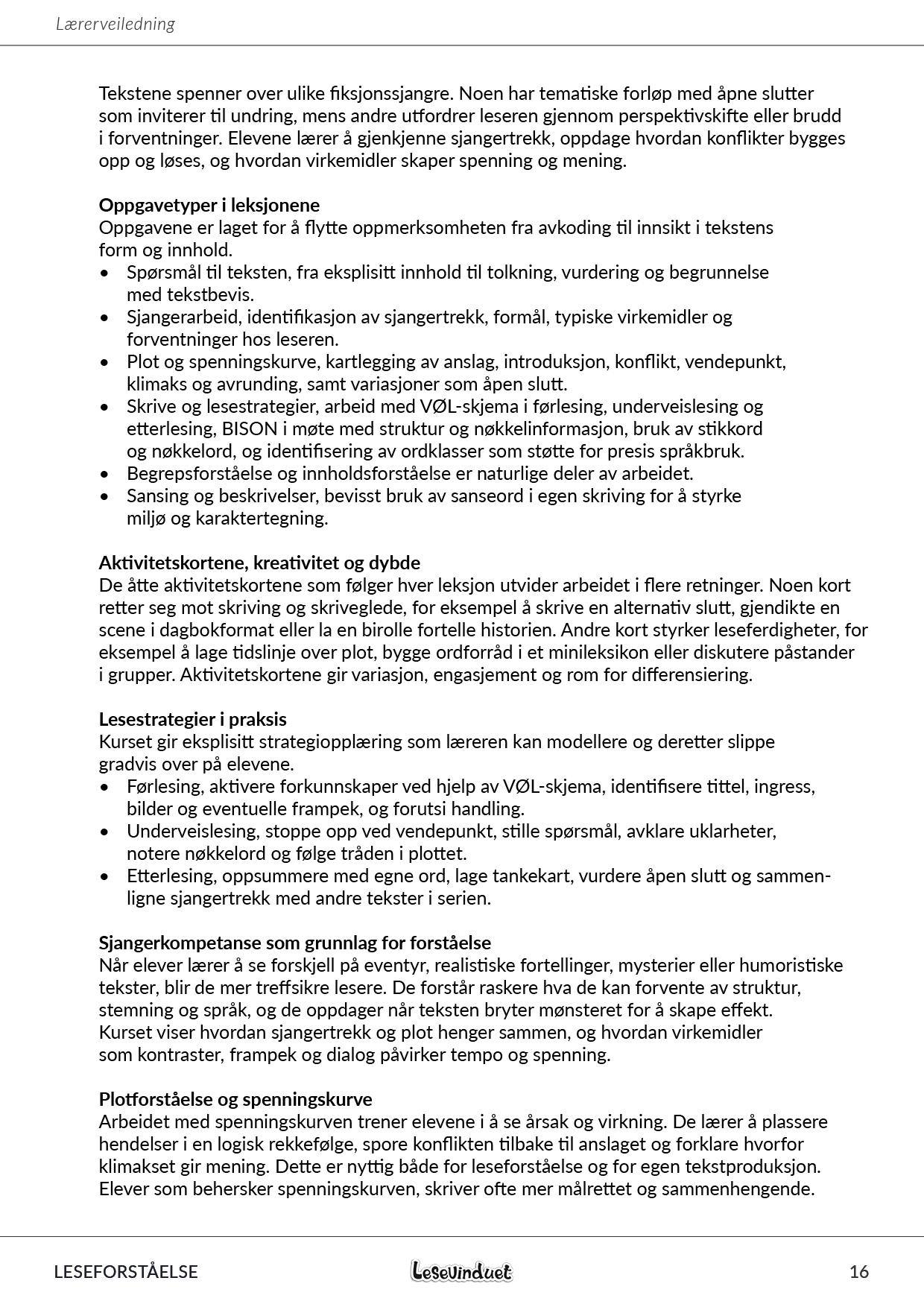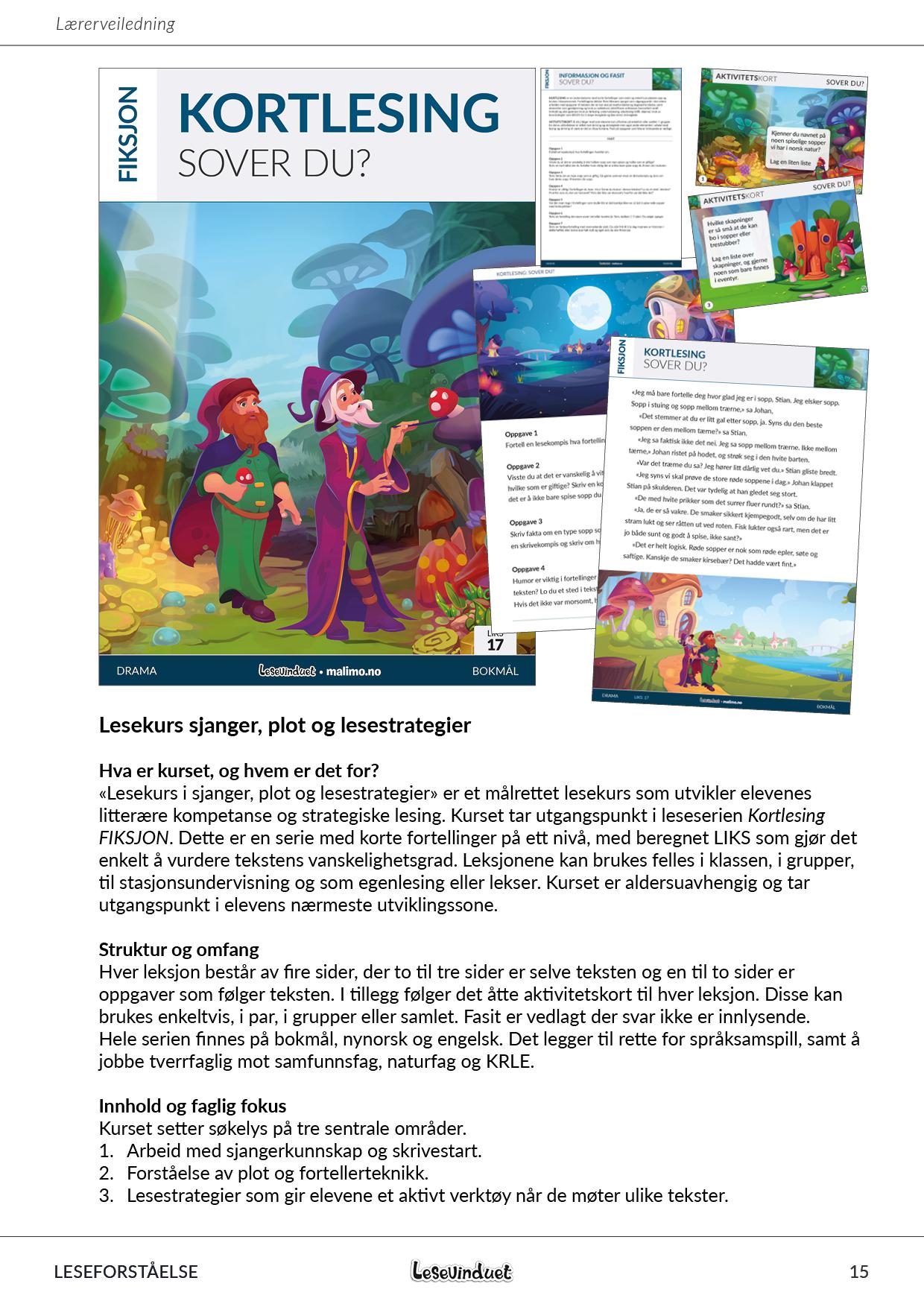 «Lesekurs i sjanger, plot og lesestrategier» er et målrettet lesekurs som utvikler elevenes litterære kompetanse og strategiske lesing. Kurset tar utgangspunkt i leseserien Kortlesing FIKSJON. Dette er en serie med korte fortellinger på ett nivå, med beregnet LIKS som gjør det enkelt å vurdere tekstens vanskelighetsgrad. Leksjonene kan brukes felles i klassen, i grupper, til stasjonsundervisning og som egenlesing eller lekser. Kurset er aldersuavhengig og tar utgangspunkt i elevens nærmeste utviklingssone.