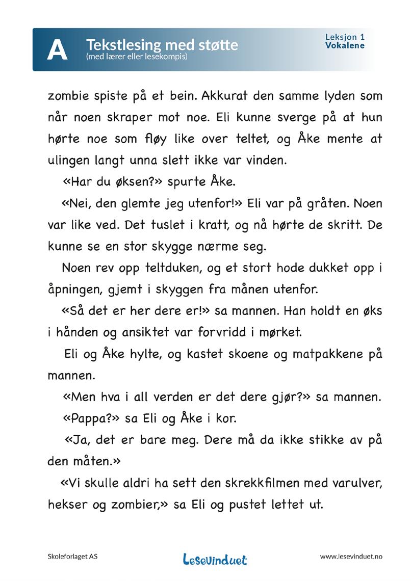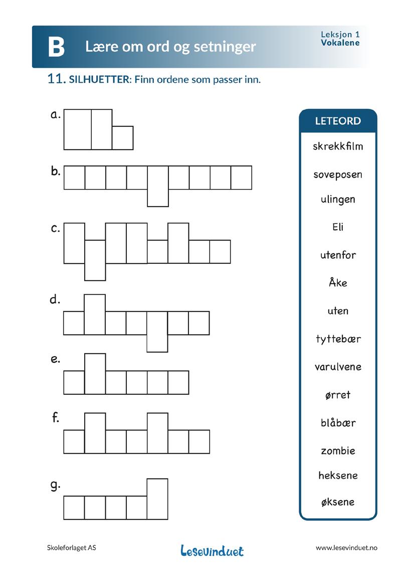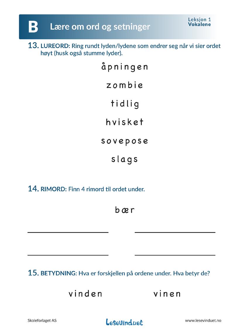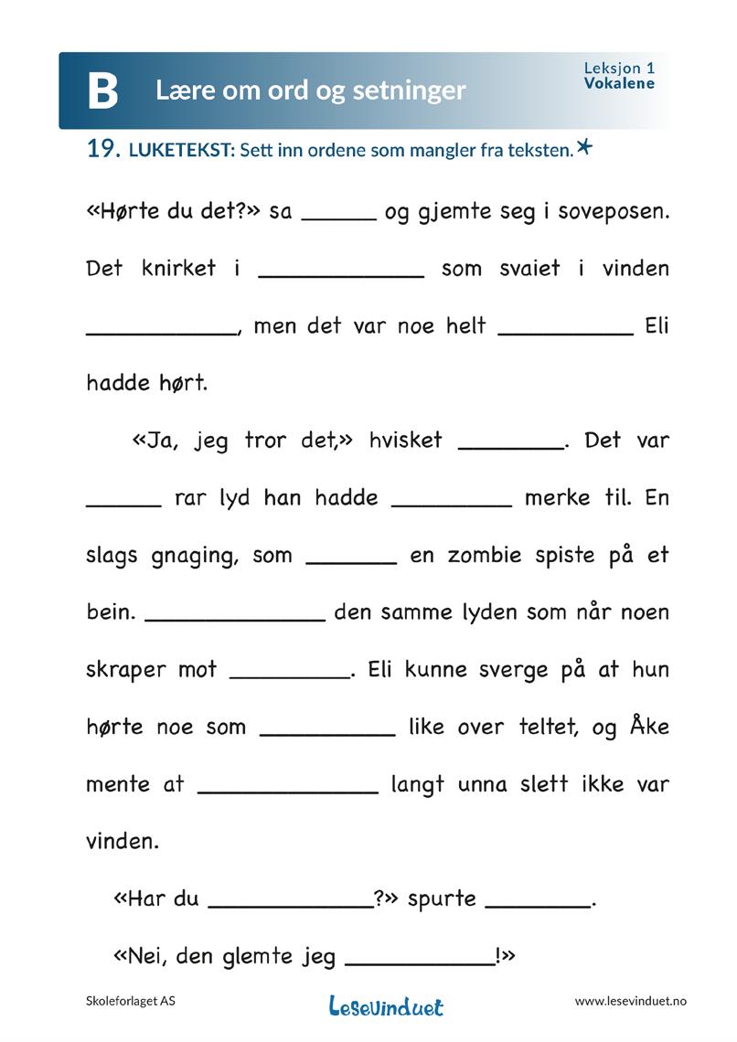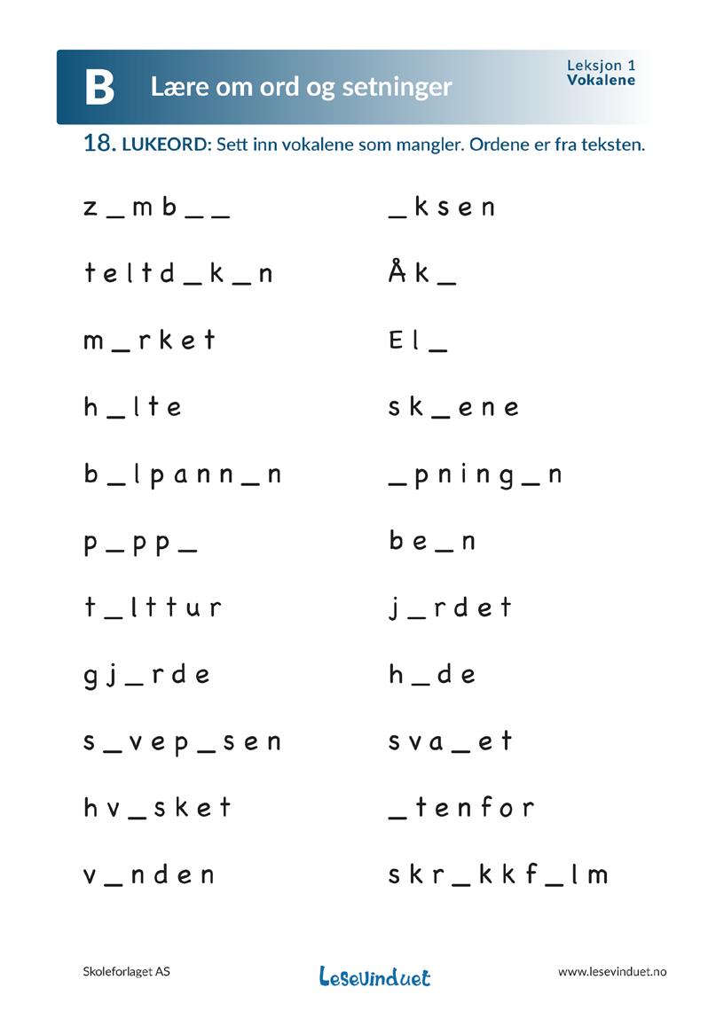 Lukeord er en fin måte å jobbe på for å identifisere manglende grafemer og fonemer i ord de nå har lest ofte i teksten. Alle ord her er hentet fra leksjonens lesetekst og bør være oppnåelig å finne ut av. Les gjerne det som står og fjerne de manglende lydene for å støtte underveis. Lærer elevene å lese det de ser (gjerne høyt) så hører og ser de raskere hva ordet er. Det kan være lurt å gjøre noen av ordene sammen ut fra hvilken elevgruppe du har.