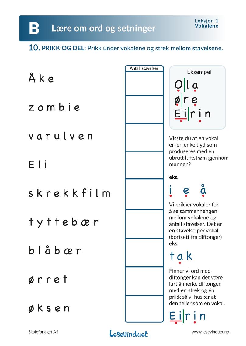 Elevene skriver inn antall stavelser i rutene til høyre for ordet. Dere kan gjøre denne oppgaven sammen, ett og ett ord av gangen ved at alle klapper Å-ke, og får markert stavelsene riktig. Eller la de arbeide først alene, og gjennomgå en og en. Elevene retter på feilene hvis det er feil.