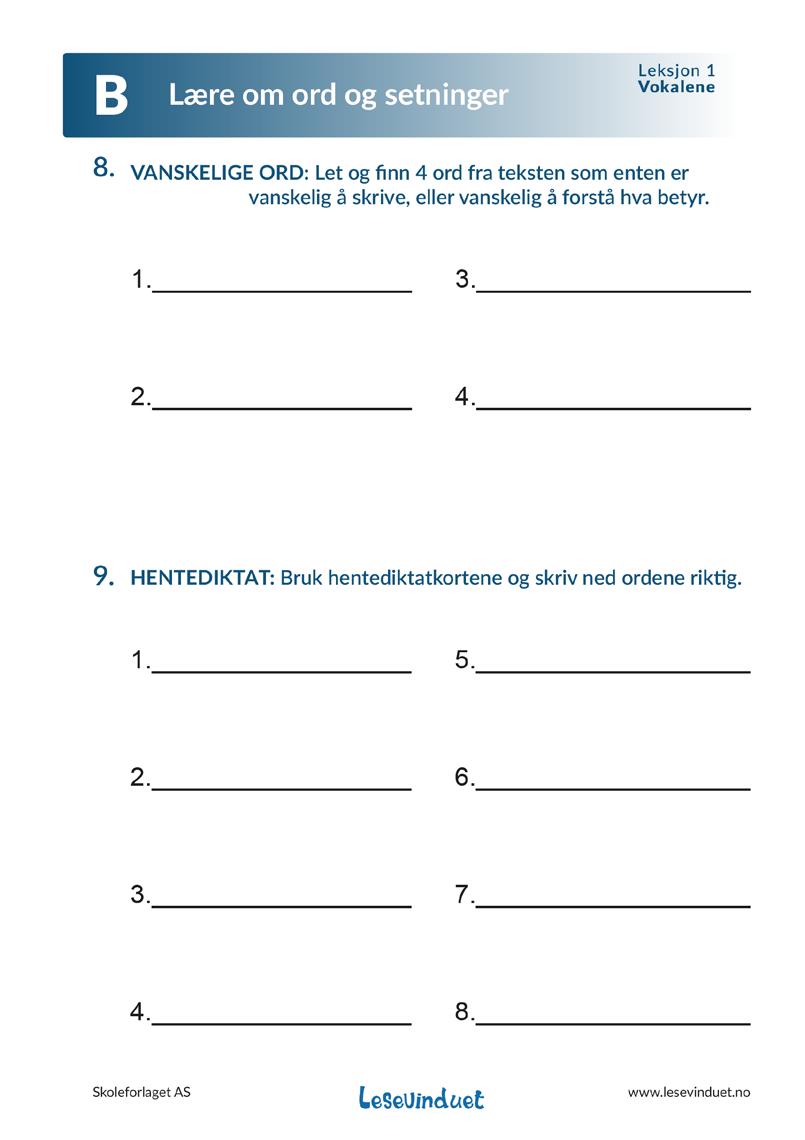 I denne oppgaven skal elevene finne fire ord som enten er vanskelig å skrive eller forstå hva ordet betyr. Enkelte ganger kan en av elevene si at ingen ord er vanskelige. Da kan eleven finne ord som han eller hun tror noen andre kan synes er vanskelige. Unngå at elevene skriver korte, enkle ord for å slippe å jobbe. Høyfrekvente småord er ofte ikke så vanskelige. Still krav og forventninger til elevene. Du kan godt si at de skal finne vanskelige ord som er lange. Her kan elevene også klappe stavelsene i ordene, og spørre hvordan ordet skrives. Skriv det eleven sier på tavla og er det skrevet feil, skal ordet rettes på. Andre elever kan komme med forslag til riktig skrivemåte. Husk at det ikke er farlig å gjøre feil. Fint å poengtere for elevene. Stor bokstav i egennavn er også viktig her.