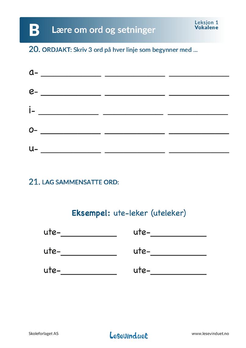 Her lager dere sammensatte ord, og første del av ordet er bestemt (noen ganger siste del av ordet). Her skal elevene finne mange ord som starter med “ute”. Det kan se vanskelig ut i starten, men når de kommer i gang blir det lettere. Eks. utesko, uteskole, utebukse, utelek, utetøy, utejakke osv. Denne oppgaven kan du jobbe videre på der elevene feks skal finne ord som har “ute” i seg. Feks: rute, prute, putetrekk, kluten osv.