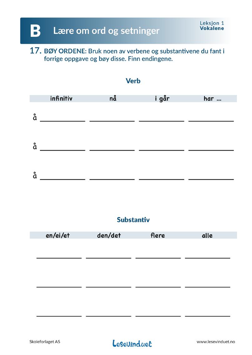 Ta utgangspunkt i oppgave 16. Elevene skriver inn 3 av verbene og substantivene de ønsker å bruke fra forrige oppgave. Merk at ordskyen i oppgave 16 har ulike bøyingsformer av ordet og at de må finne ut hvor de passer riktig inn i dette skjemaet.