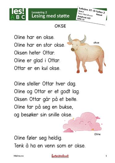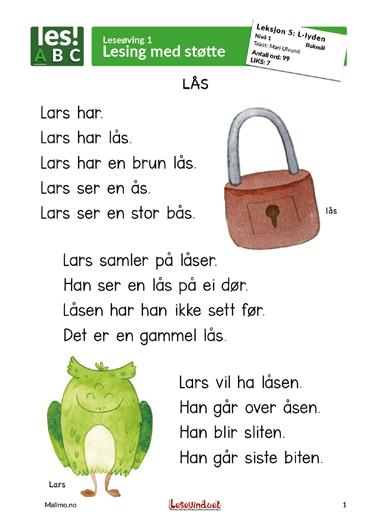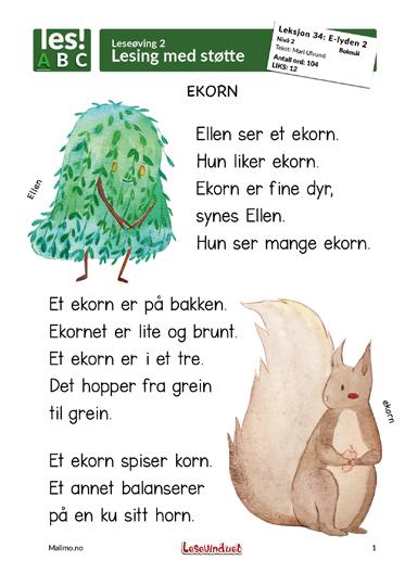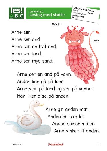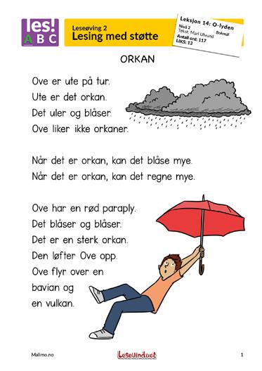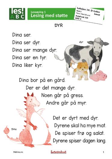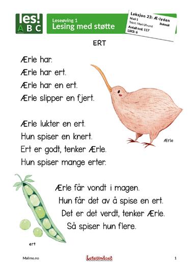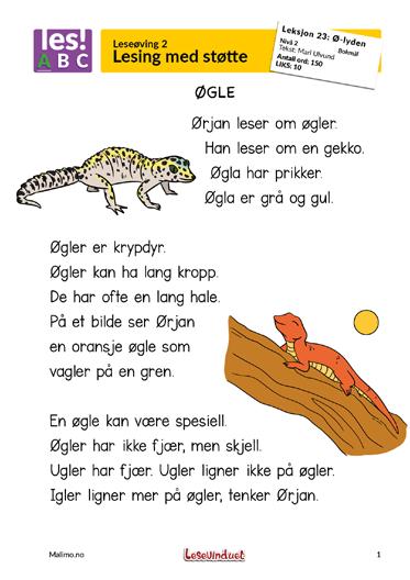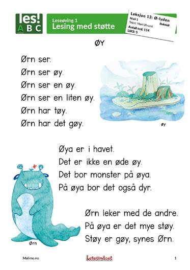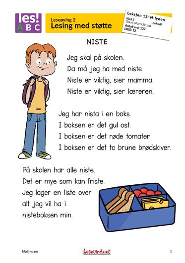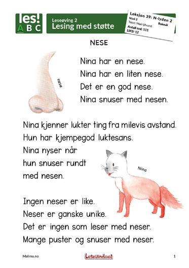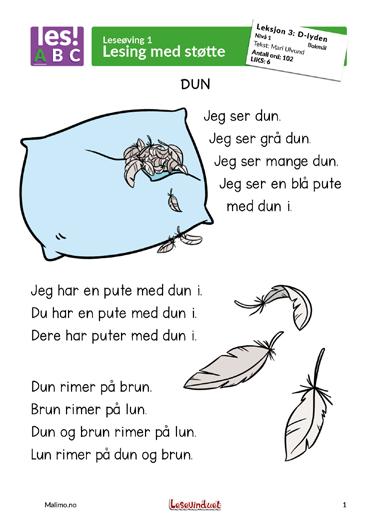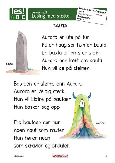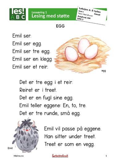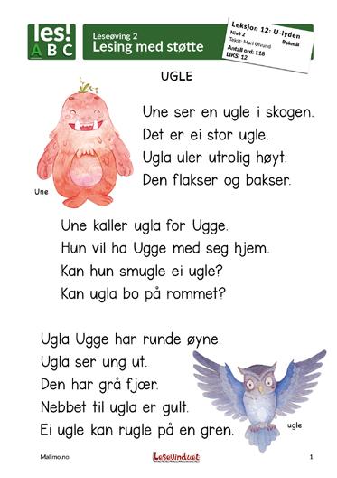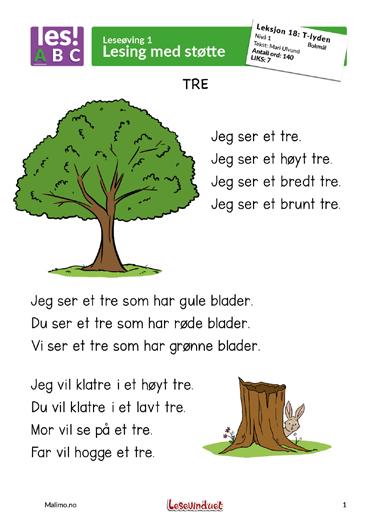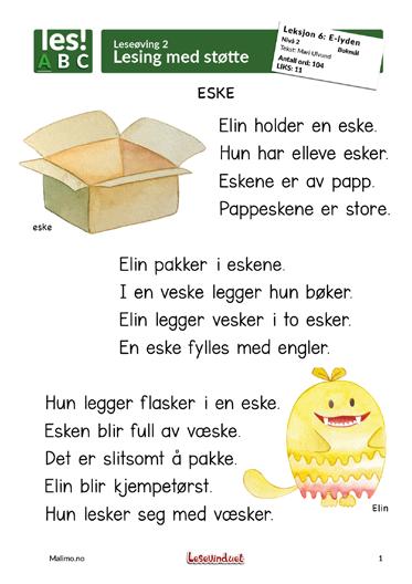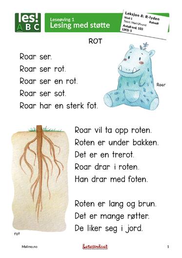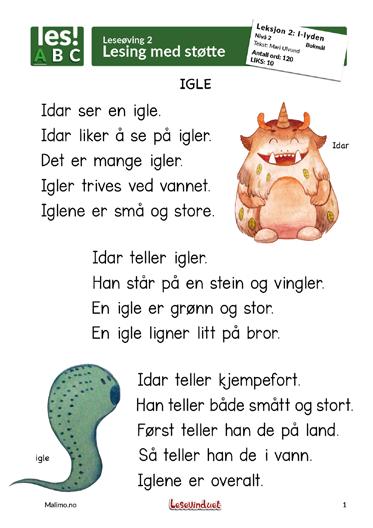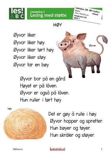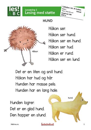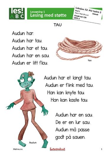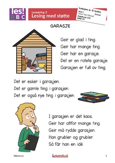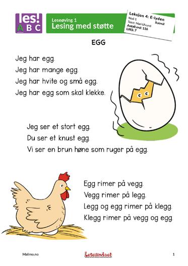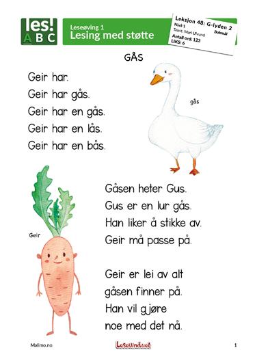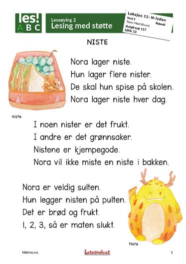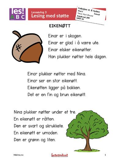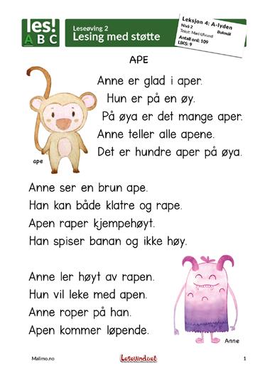 Nivå 1 har en tekst med fokusord på én stavelse, men med progresjon til tostavelsesord og økende tekstmengde underveis. Det følger spørsmål fra teksten, enkle avkodingsoppgaver og leseøvinger. Det fokuseres på rimord, gjentakelse og beskrivelse som bruk av sansene. Nivå 2 har fokusord med to stavelser, men med progresjon til trestavelsesord og økende tekstmengde underveis og sammensatte ord. Det følger spørsmål til teksten, enkle avkodings-oppgaver og leseøvinger. Det fokuseres også på rimord, gjentakelse og beskrivelse som bruk av sansene.