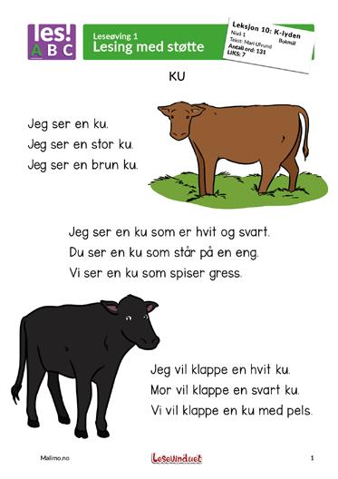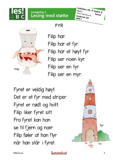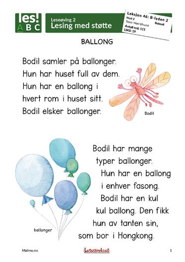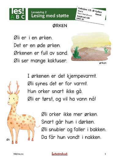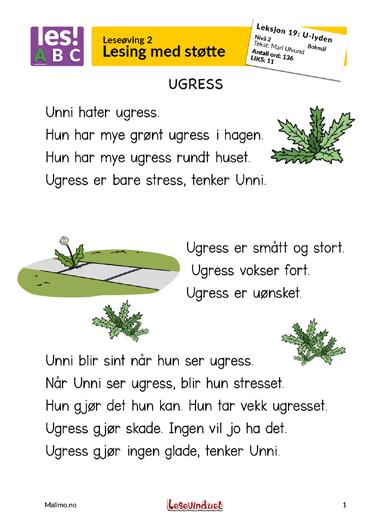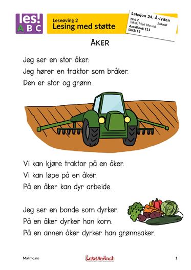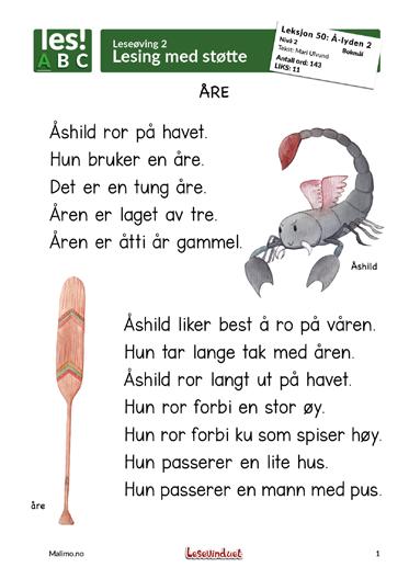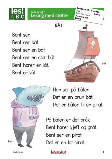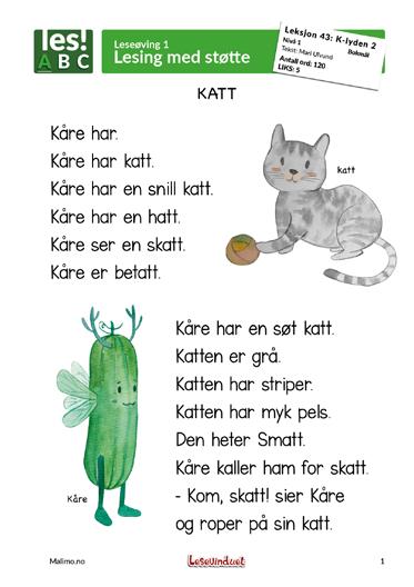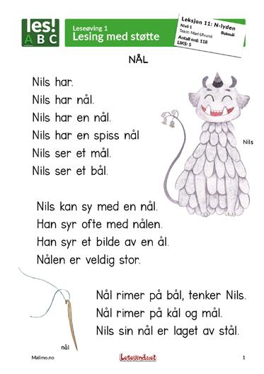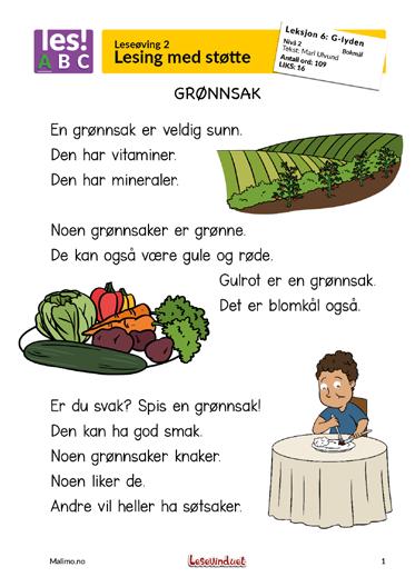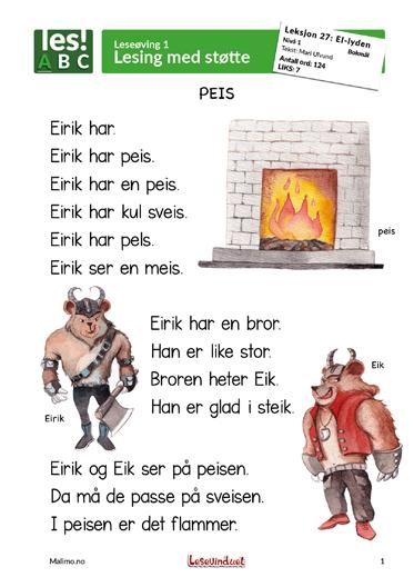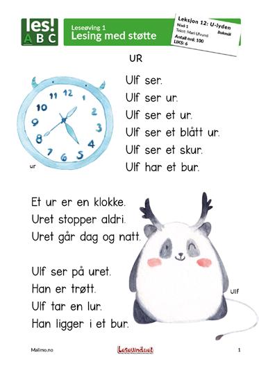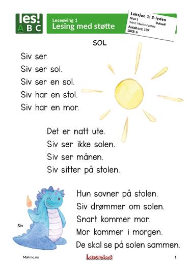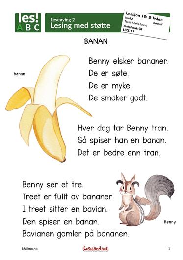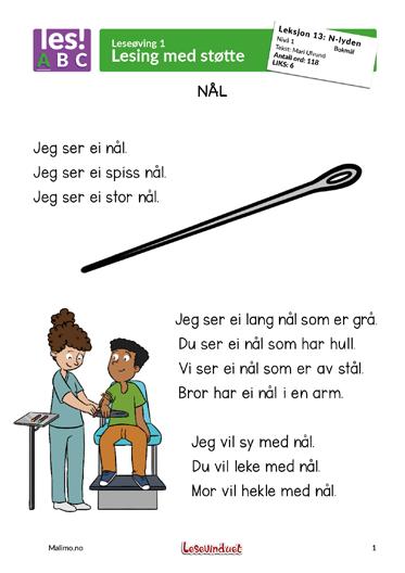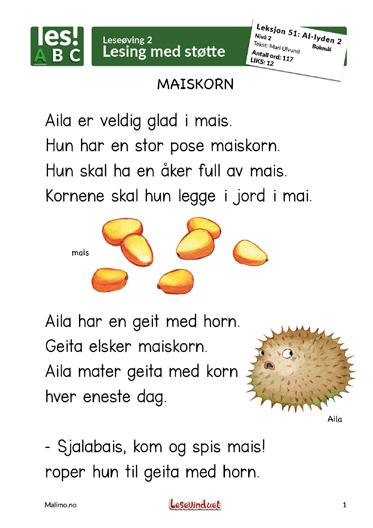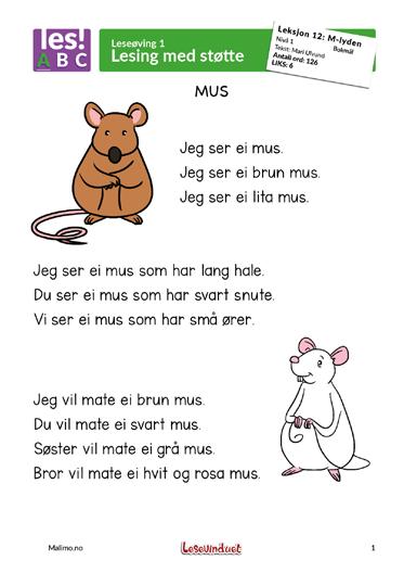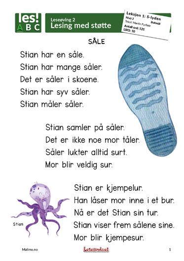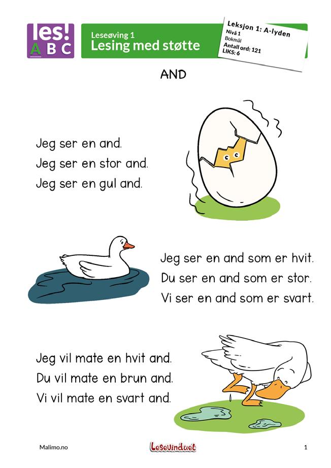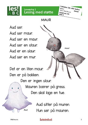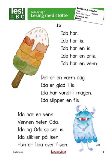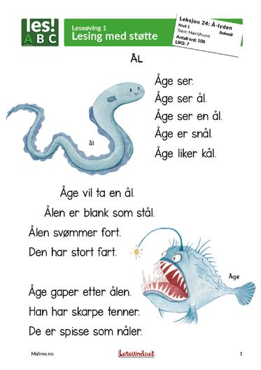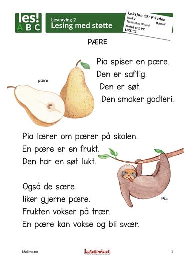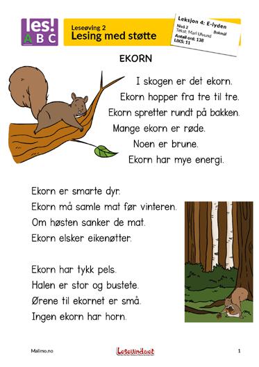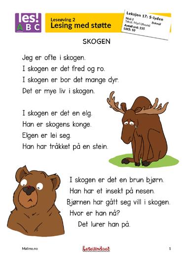 Nivå 1 har en tekst med fokusord på én stavelse, men med progresjon til tostavelsesord og økende tekstmengde underveis. Det følger spørsmål fra teksten, enkle avkodingsoppgaver og leseøvinger. Det fokuseres på rimord, gjentakelse og beskrivelse som bruk av sansene. Nivå 2 har fokusord med to stavelser, men med progresjon til trestavelsesord og økende tekstmengde underveis og sammensatte ord. Det følger spørsmål til teksten, enkle avkodings-oppgaver og leseøvinger. Det fokuseres også på rimord, gjentakelse og beskrivelse som bruk av sansene.