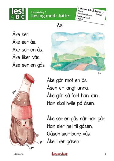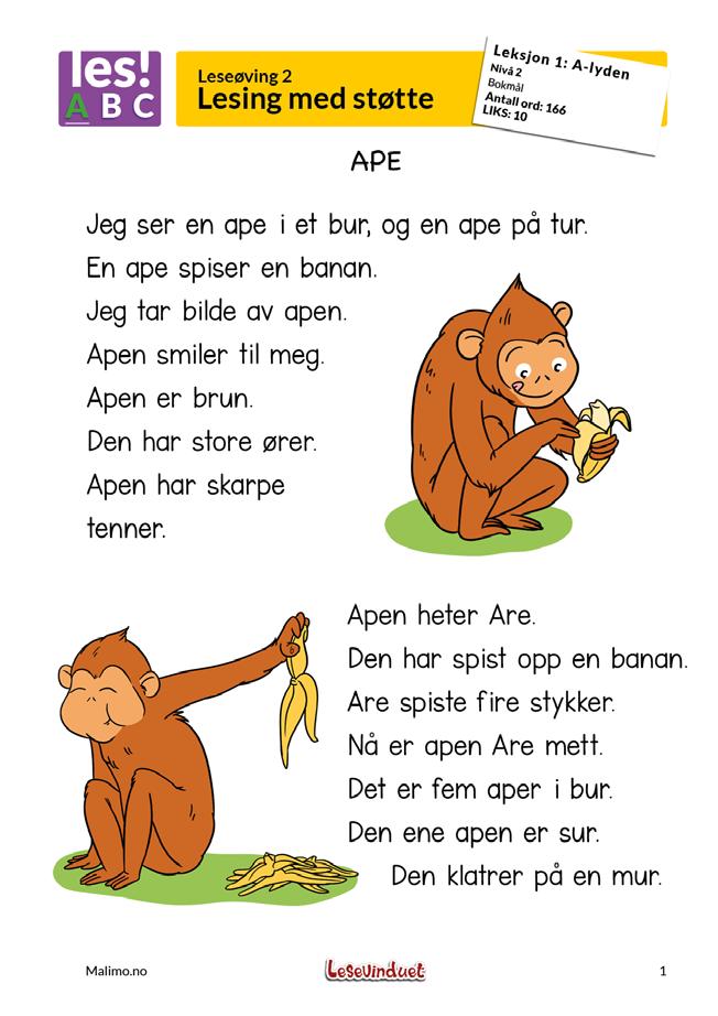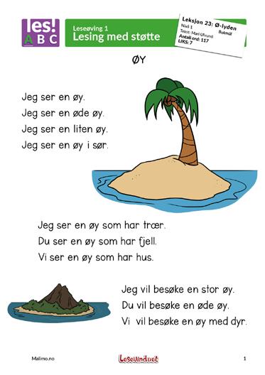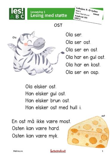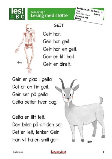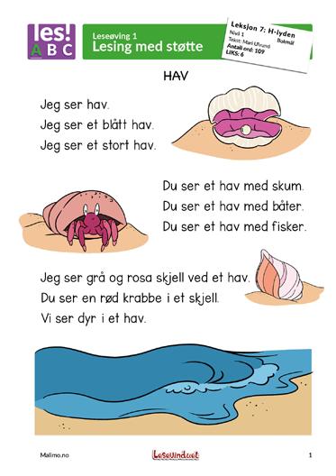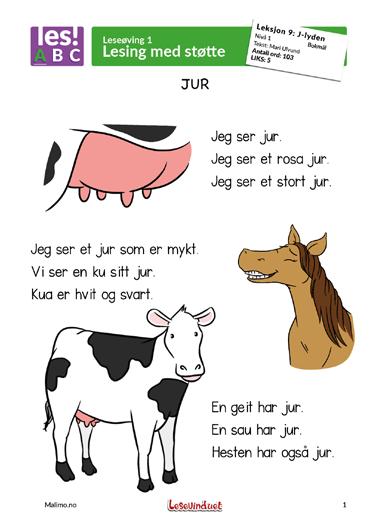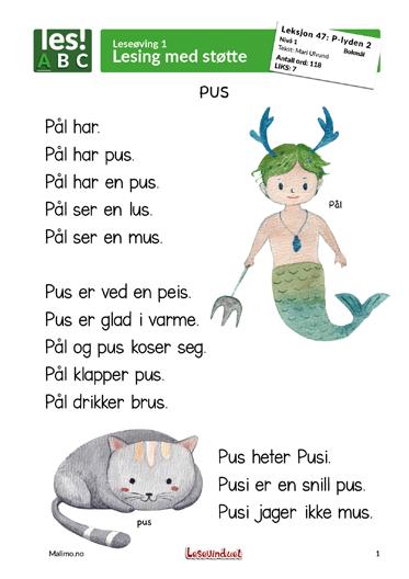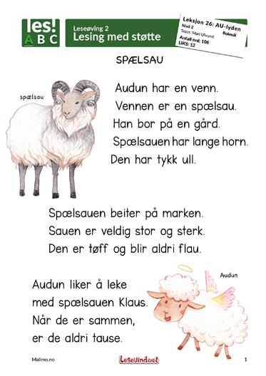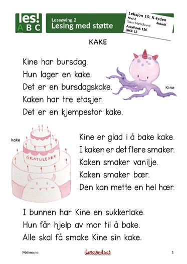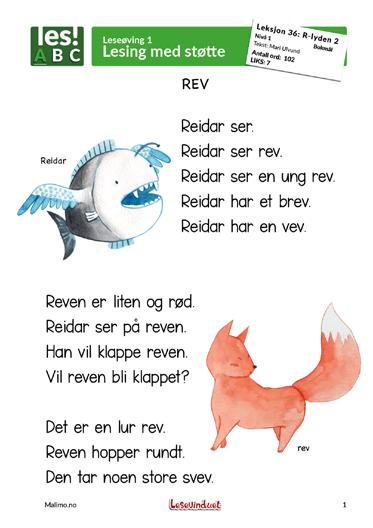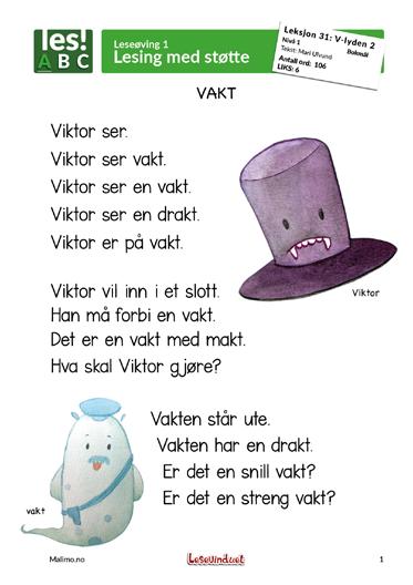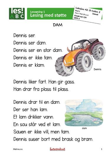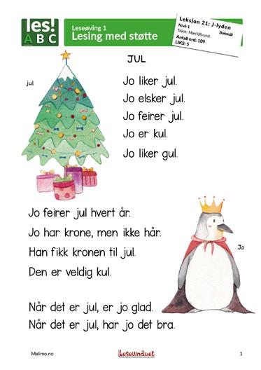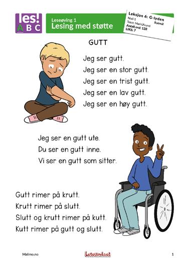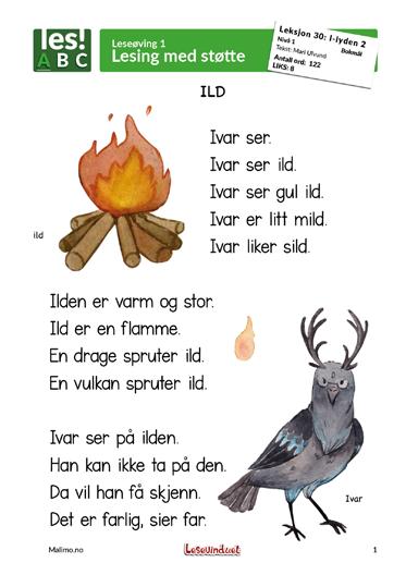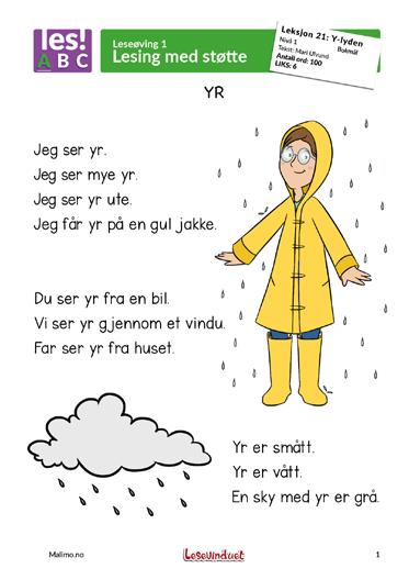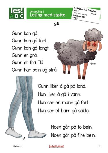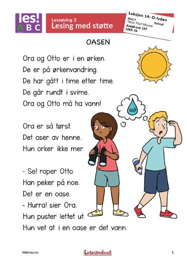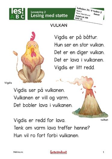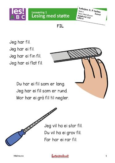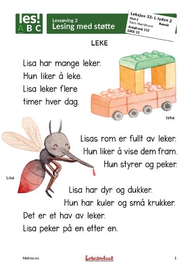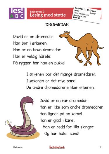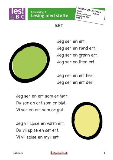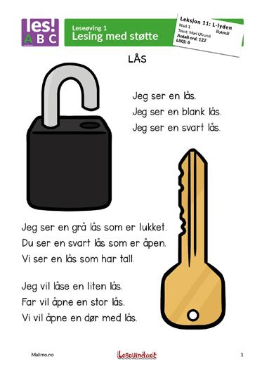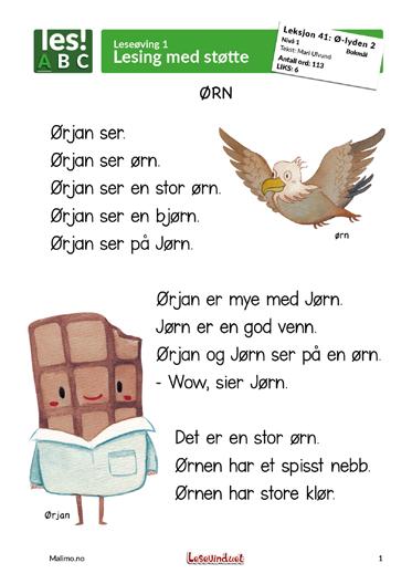 Nivå 1 har en tekst med fokusord på én stavelse, men med progresjon til tostavelsesord og økende tekstmengde underveis. Det følger spørsmål fra teksten, enkle avkodingsoppgaver og leseøvinger. Det fokuseres på rimord, gjentakelse og beskrivelse som bruk av sansene. Nivå 2 har fokusord med to stavelser, men med progresjon til trestavelsesord og økende tekstmengde underveis og sammensatte ord. Det følger spørsmål til teksten, enkle avkodings-oppgaver og leseøvinger. Det fokuseres også på rimord, gjentakelse og beskrivelse som bruk av sansene.