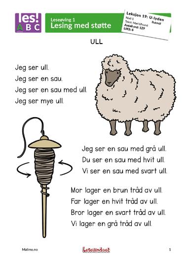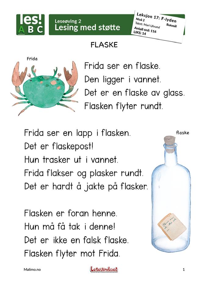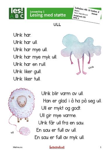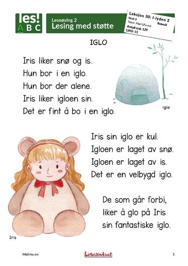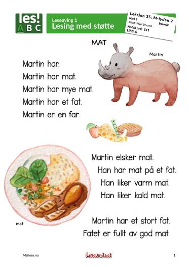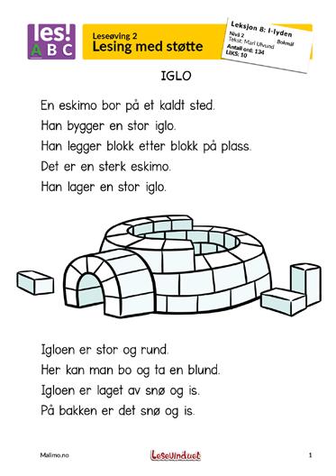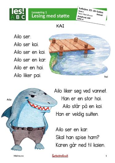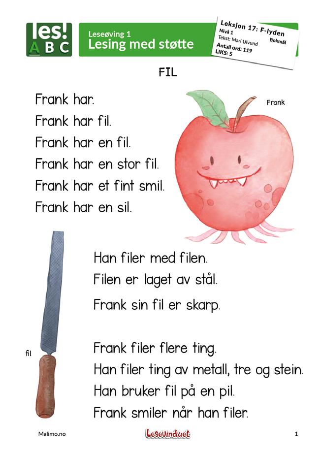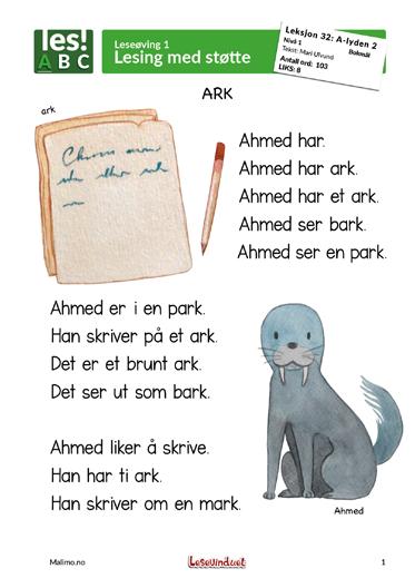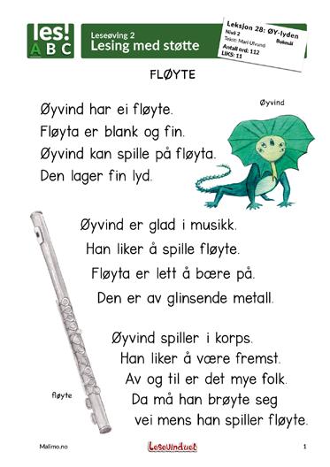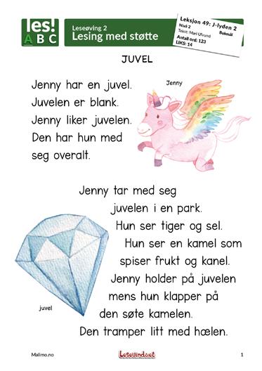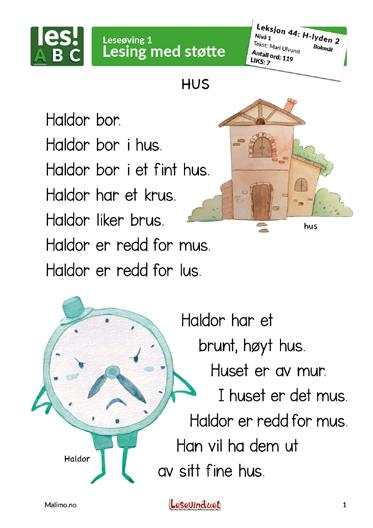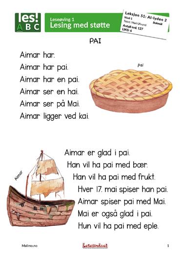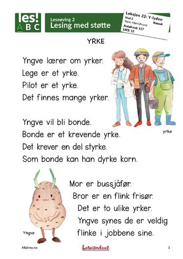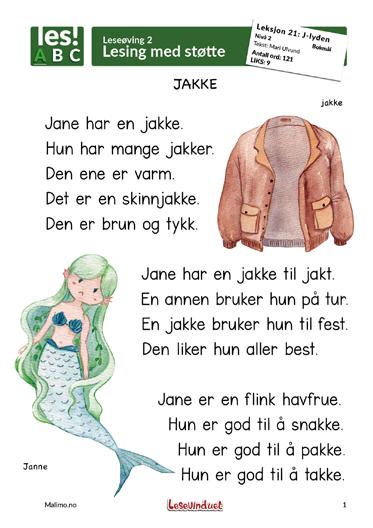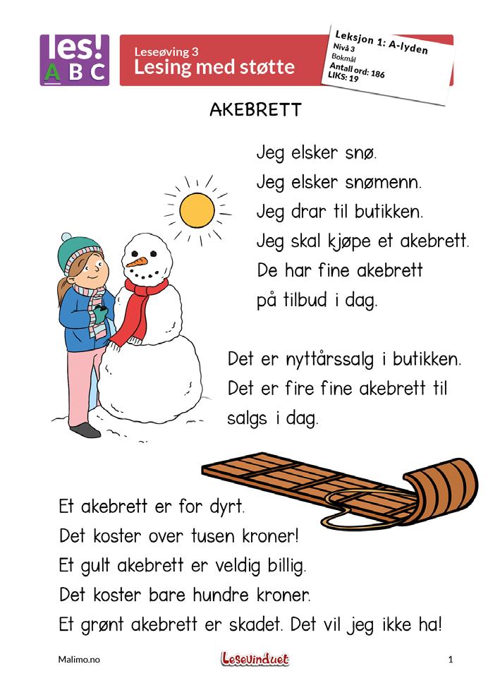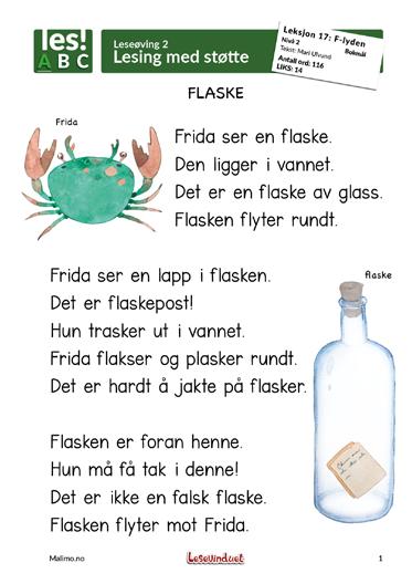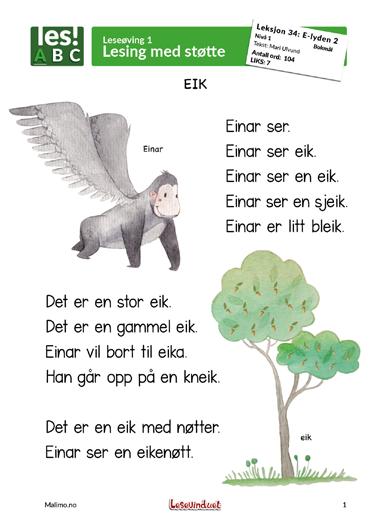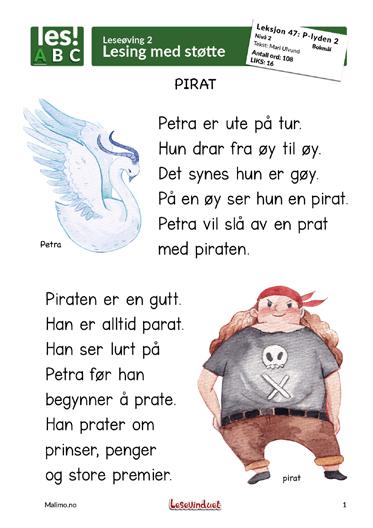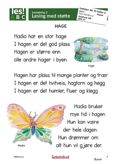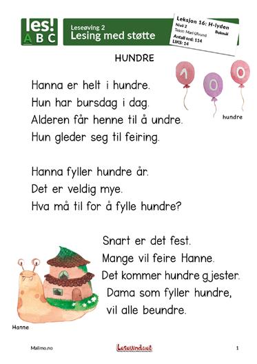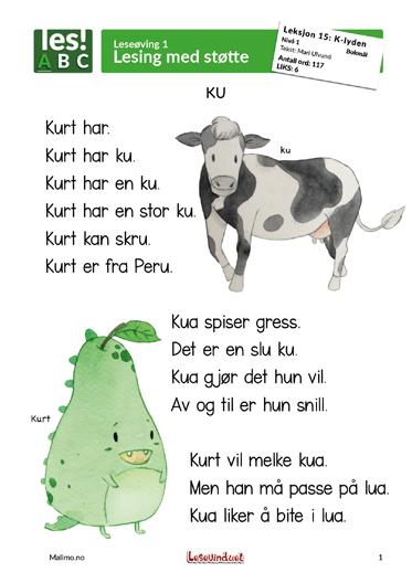 Nivå 1 har en tekst med fokusord på én stavelse, men med progresjon til tostavelsesord og økende tekstmengde underveis. Det følger spørsmål fra teksten, enkle avkodingsoppgaver og leseøvinger. Det fokuseres på rimord, gjentakelse og beskrivelse som bruk av sansene. Nivå 2 har fokusord med to stavelser, men med progresjon til trestavelsesord og økende tekstmengde underveis og sammensatte ord. Det følger spørsmål til teksten, enkle avkodings-oppgaver og leseøvinger. Det fokuseres også på rimord, gjentakelse og beskrivelse som bruk av sansene.