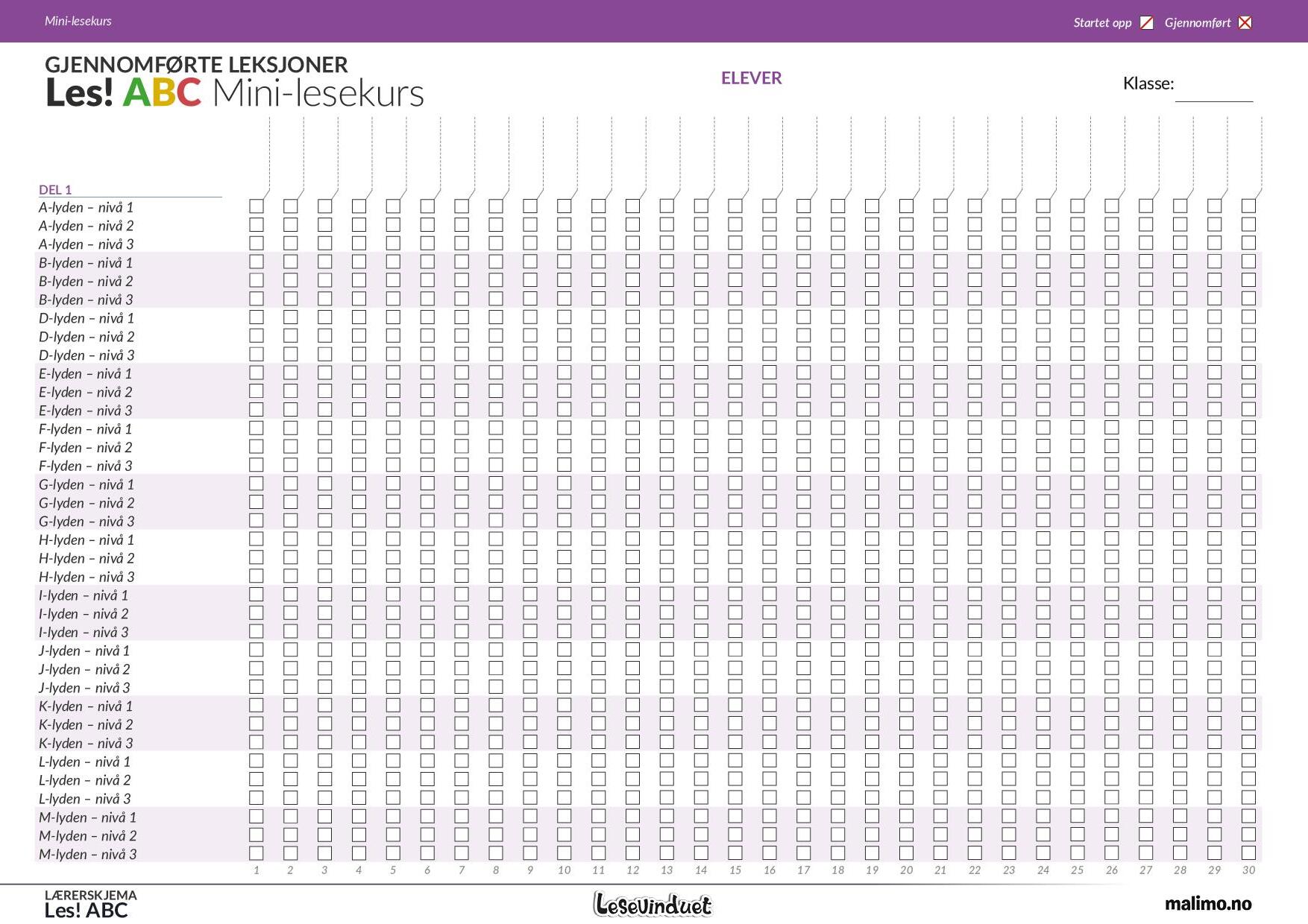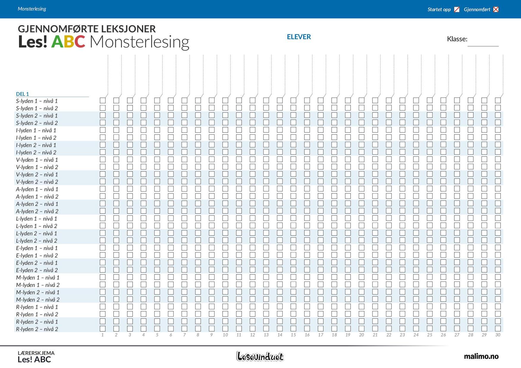 Skjemaet for gjennomførte leksjoner gir en oversikt over hvilke elever som har gjennomført og avsluttet de ulike leksjonene i Monsterlesing og Mini-lesekurs.