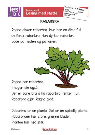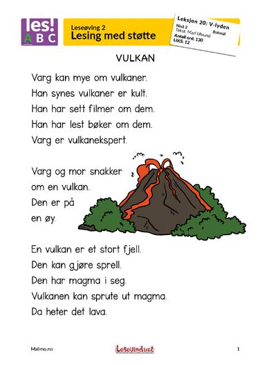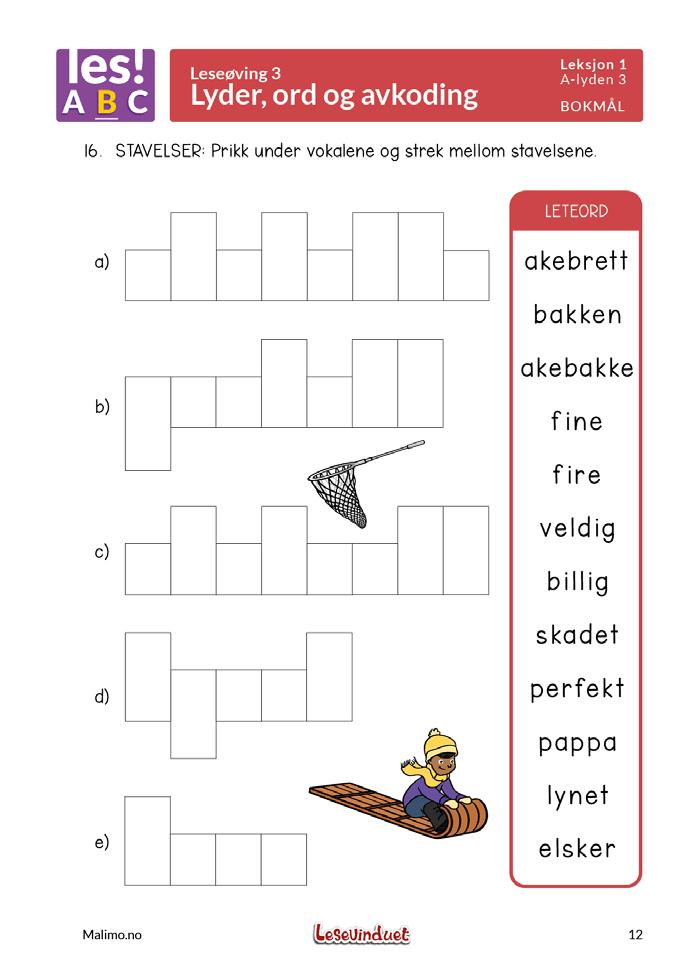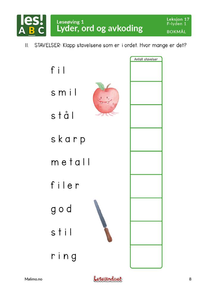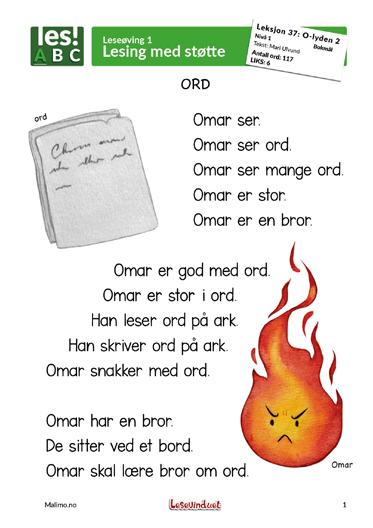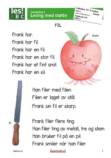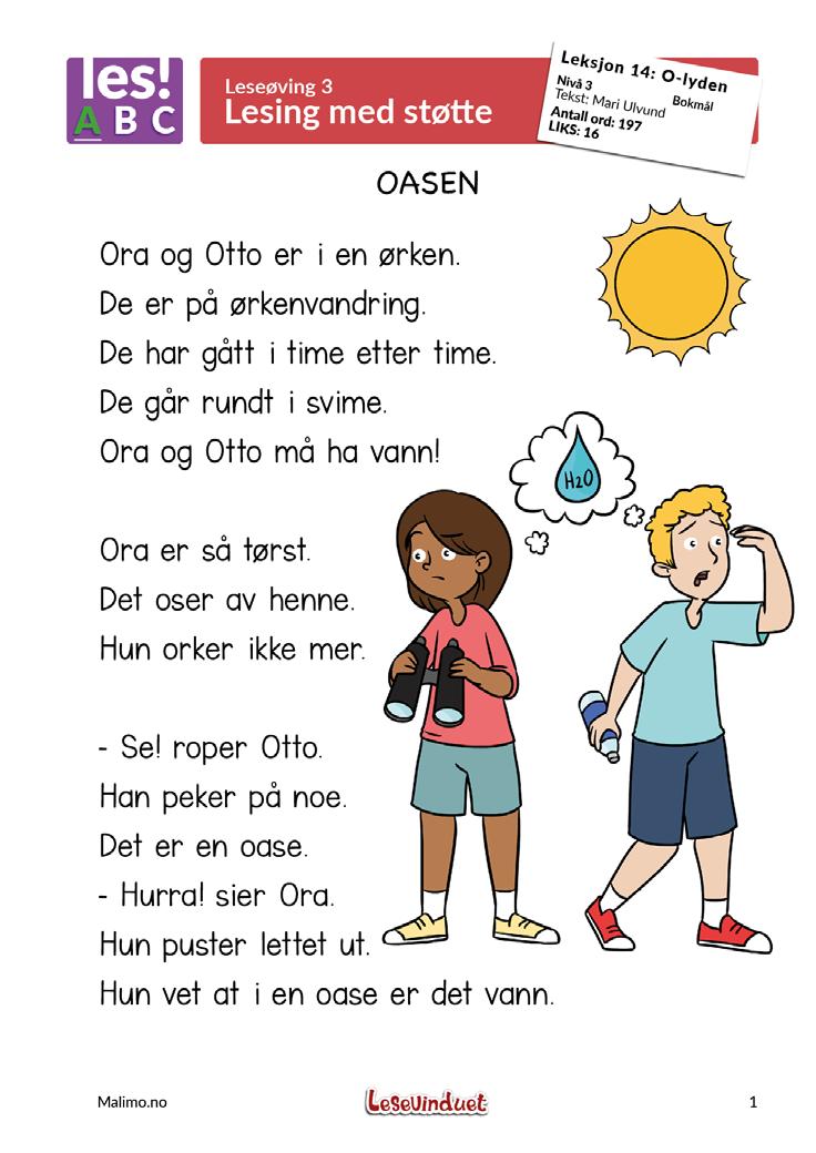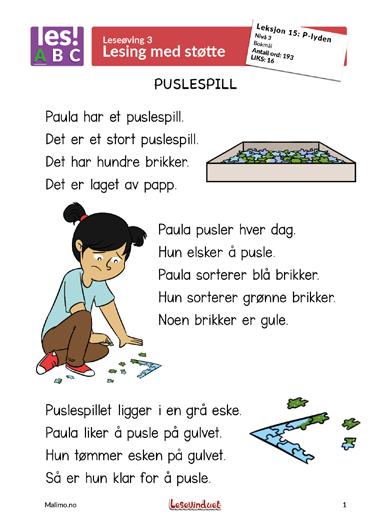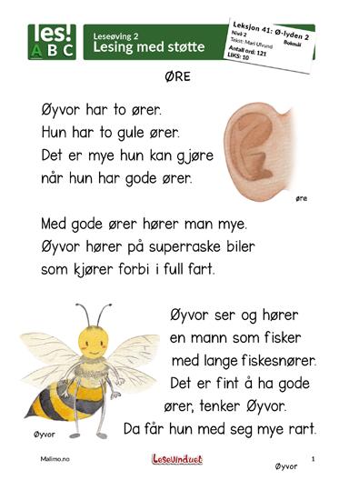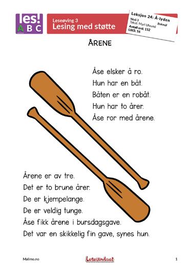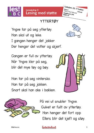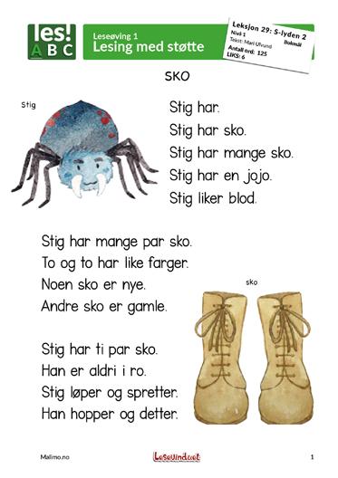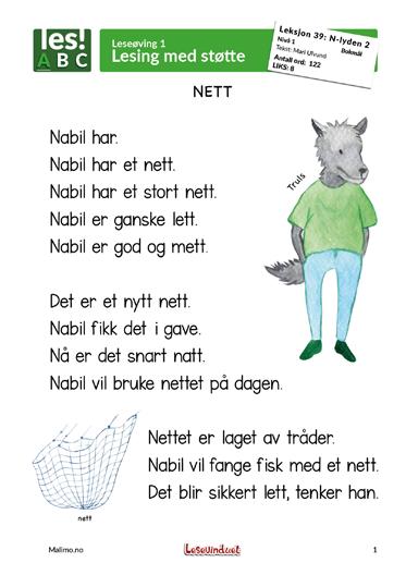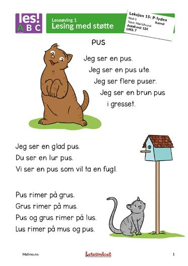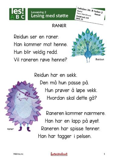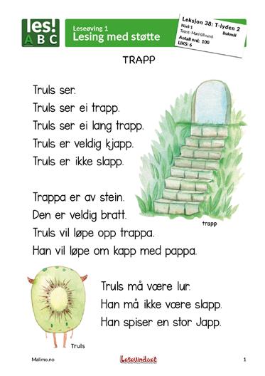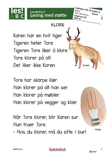 Det følger med spørsmål fra teksten, enkle avkodingsoppgaver og lese-øvinger til hvert nivå. Det fokuseres på gjentakelse, rimord, beskrivelse og ulik bruk av ordet i en setning. Nivå 1 har fokusord med én enkelt stavelse. Teksten består stort sett av énstavelsesord fra korte til litt lengre setninger. Nivå 2 har fokusord med to stavelser. Teksten inneholder færre korte ord som på nivå 1. Teksten består av én- og tostavelsesord Nivå 3 fokusord med tre stavelser. Teksten inneholder lengre ord enn ord på nivå 2, og lengre varierte setninger. Teksten består av én-, to- og enkelte trestavelsesord.