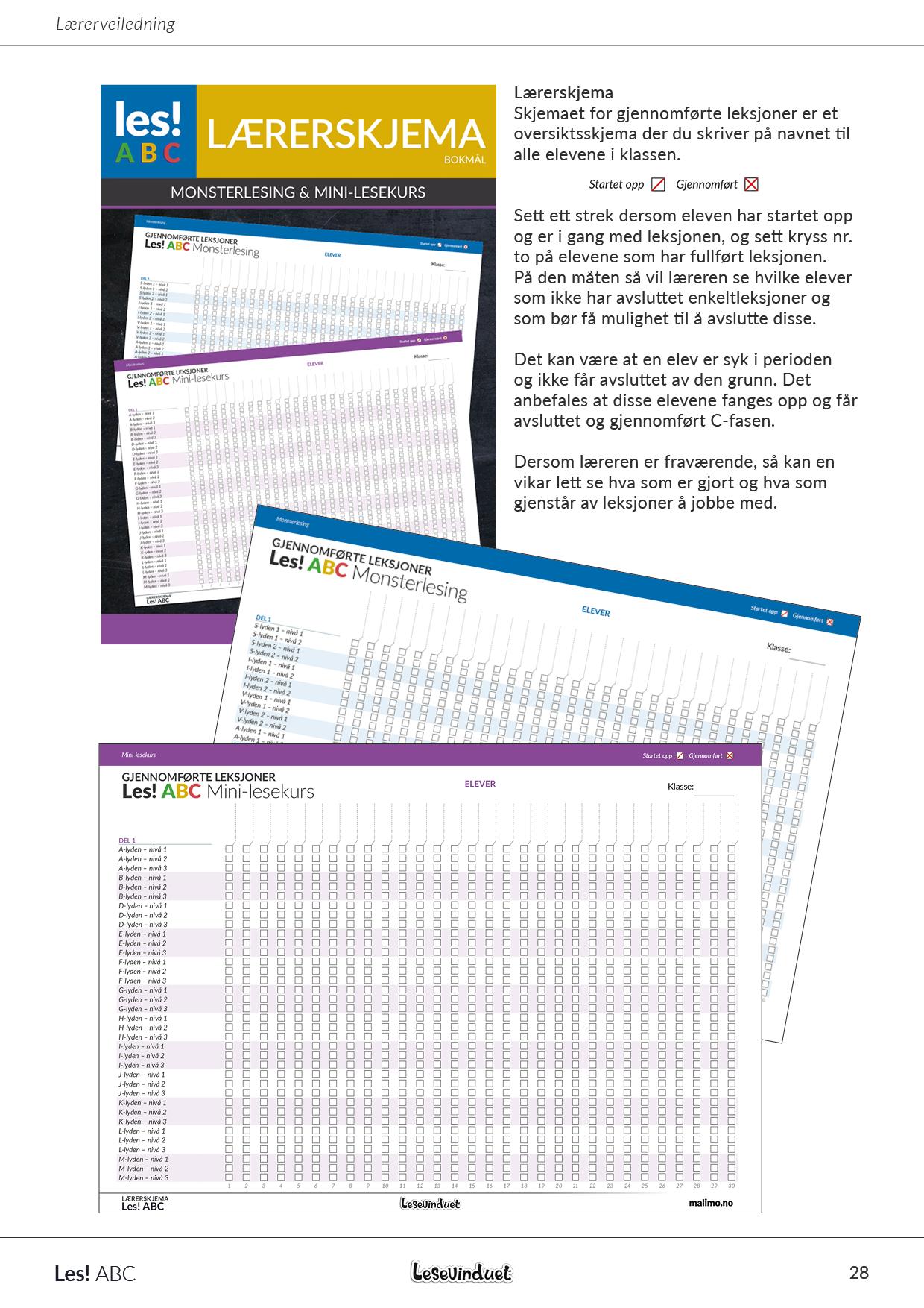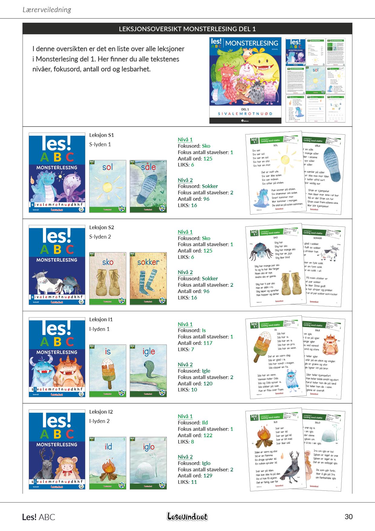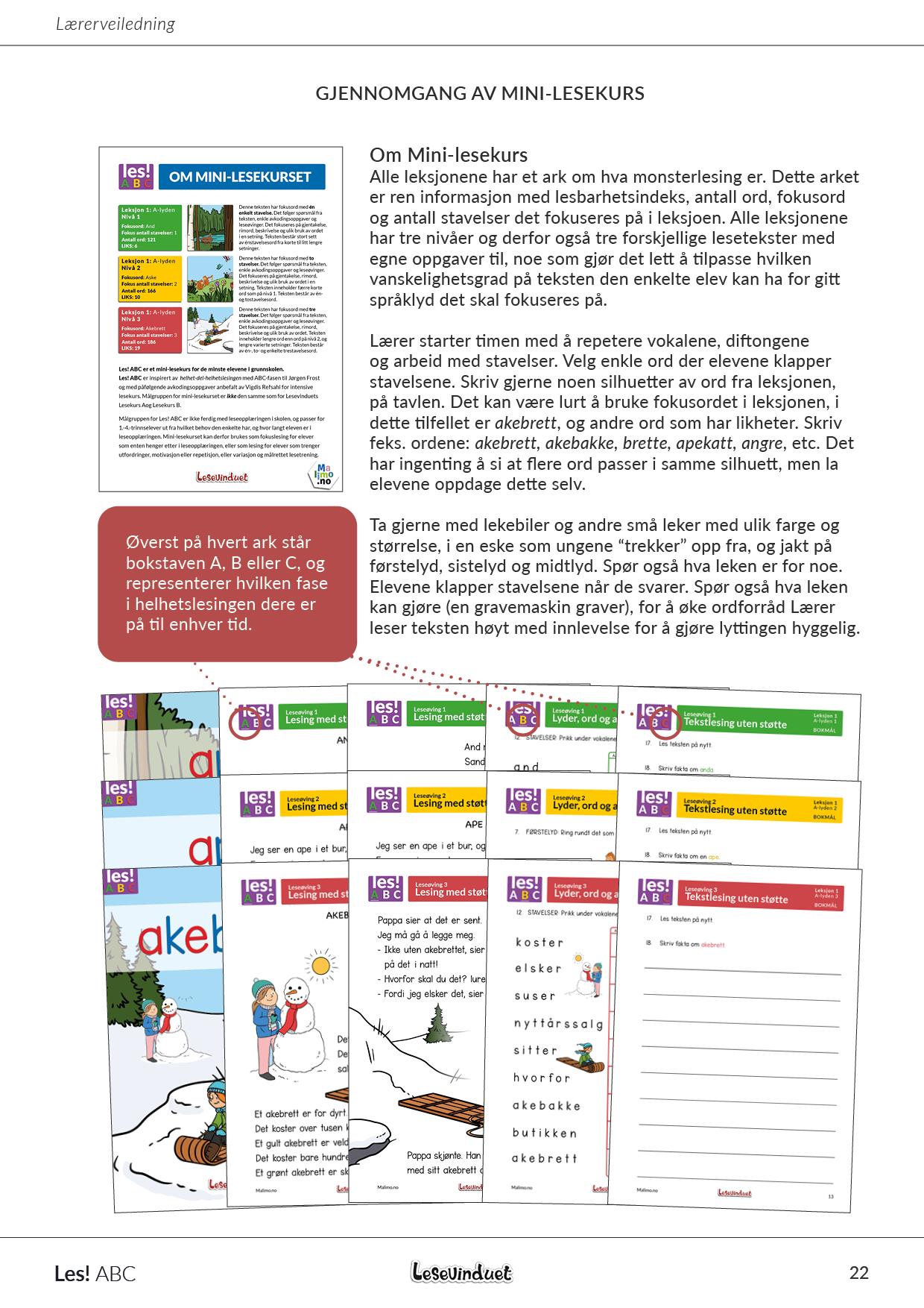 Lærerveiledningen gir en teoretisk og praktisk innføring i serien Les! ABC. I tillegg viser den en gjennomgang av en leksjon av Monsterlesing og Mini-lesekurs.