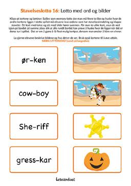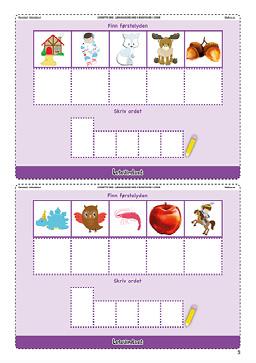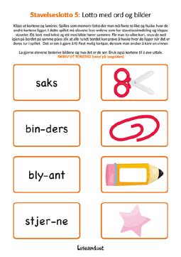 Arbeid med enkeltord og koble bilder til ordene. Kan spilles som memory-lotto. Klapp stavelser, finn førstelyd, midtlyd og sistelyd, beskriv bildene og lag en setning muntlig.